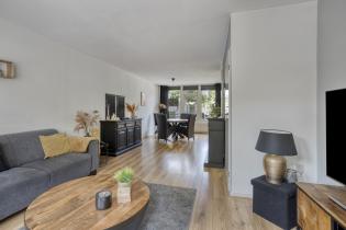 De keurige woonkamer is gelegen over de gehele lengte van de woning en beschikt over een fraaie laminaatvloer. Aan de voorzijde is de woonkamer voorzien van een sfeervol zitgedeelte met grote raampartij en praktische trapkast voor extra bergruimte.