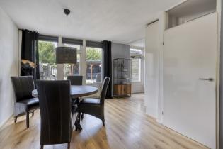 Aan de achterzijde is de woonkamer voorzien van een groot eetgedeelte met ruimte voor een grote eettafel. Door wederom een grote raampartij is het eetgedeelte voorzien van veel natuurlijk daglicht en een prettig contact met de achtertuin. Een open doorgang biedt toegang tot de keuken.