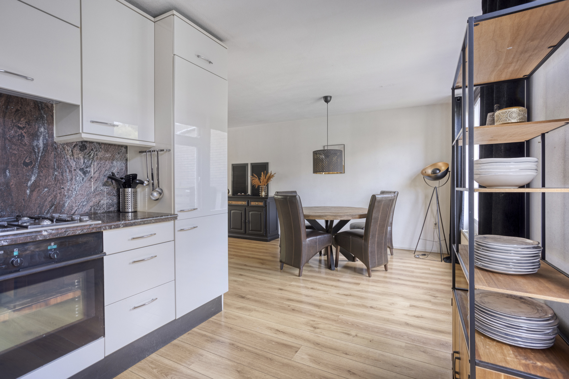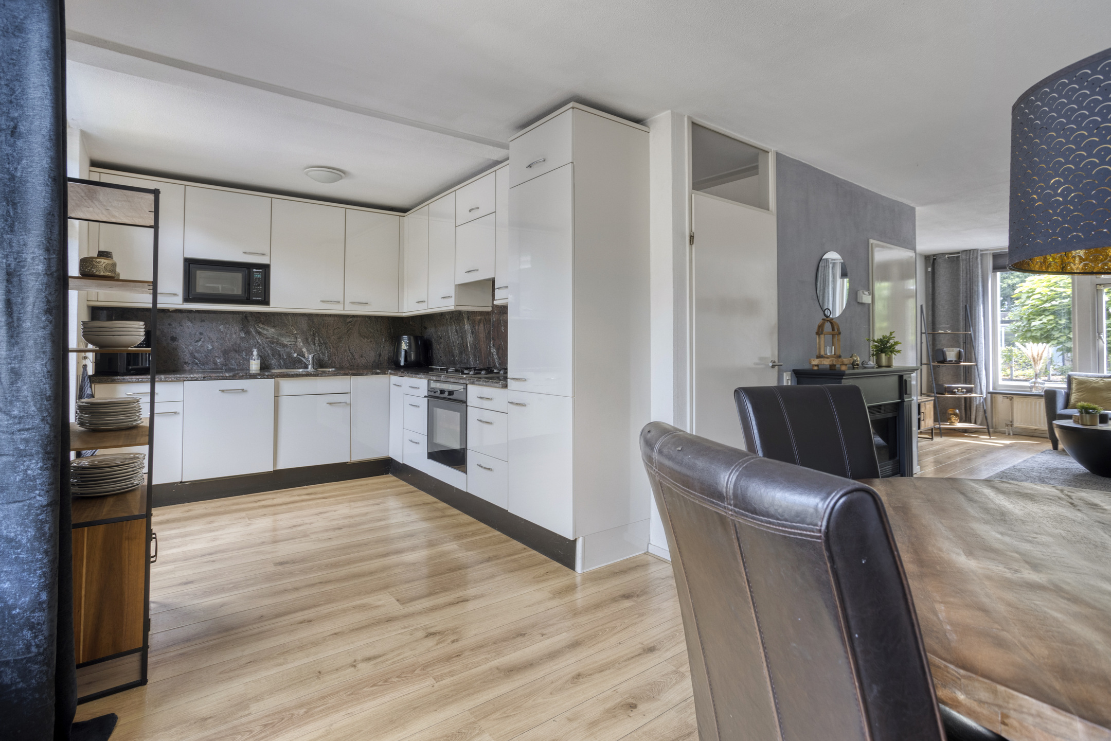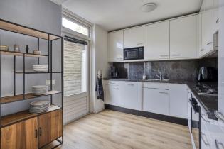 De achterzijde van de woning is voorzien van de open keuken. Deze keuken is opgebouwd met een hoekopstelling in lichte kleurstelling en voorzien van inbouwapparatuur. Zo beschikt de keuken over een koel-/vriescombinatie, een oven, een 4-pits gaskookplaat met afzuigkap, een vaatwasser en een magnetron.