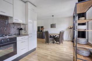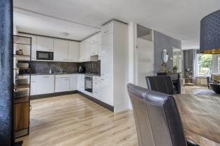 At the rear, the living room has a spacious dining area with room for a large dining table. Thanks to the wide windows, the dining area enjoys abundant natural light and a pleasant connection to the garden. An open passage leads to the kitchen.