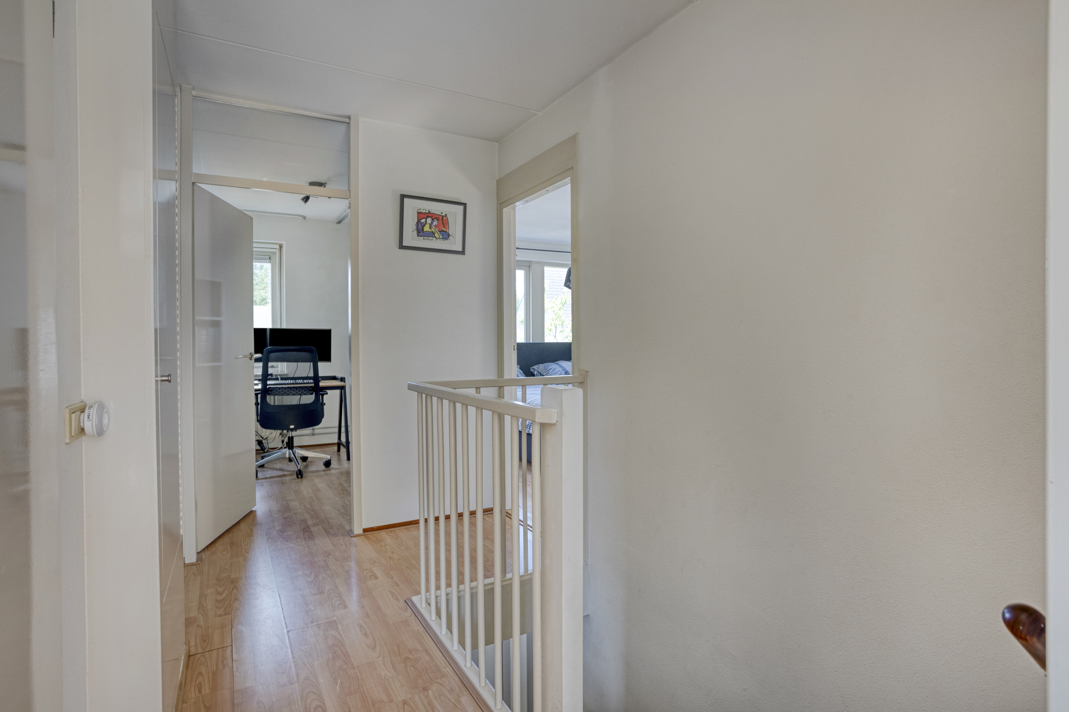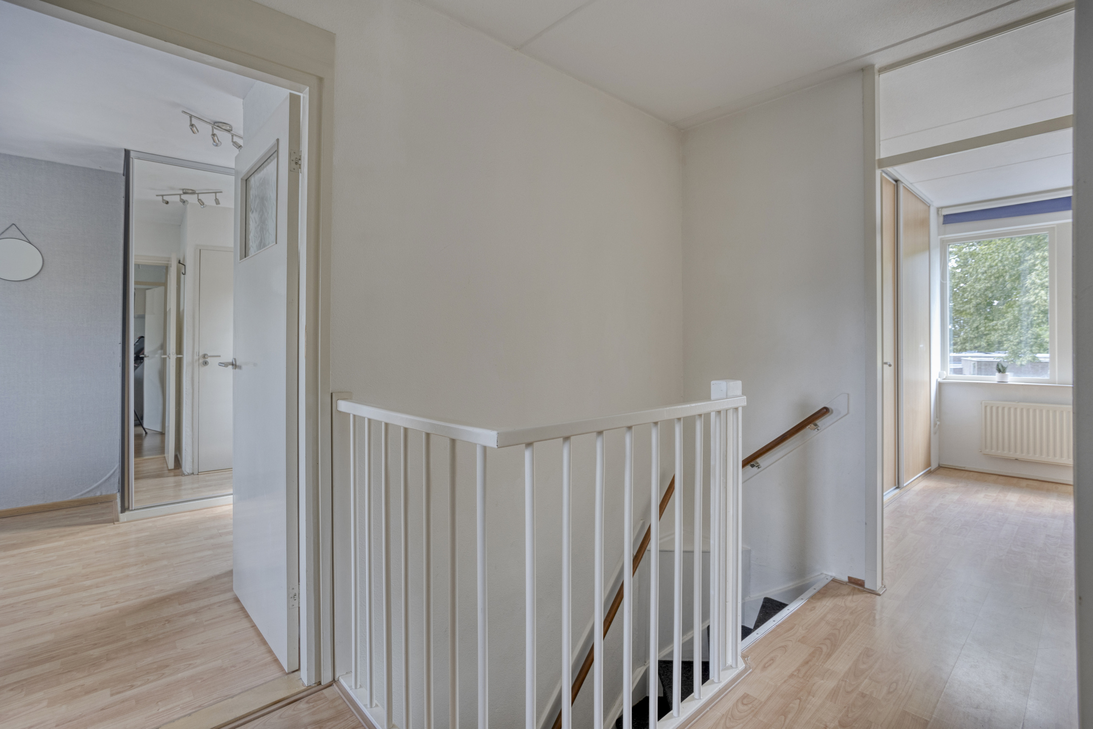 Vanuit de trapopgang in de hal bereikt u de overloop op de eerste verdieping. De overloop beschikt over toegang tot vier slaapkamers, de badkamer en een kast met de C.V.-ketel.