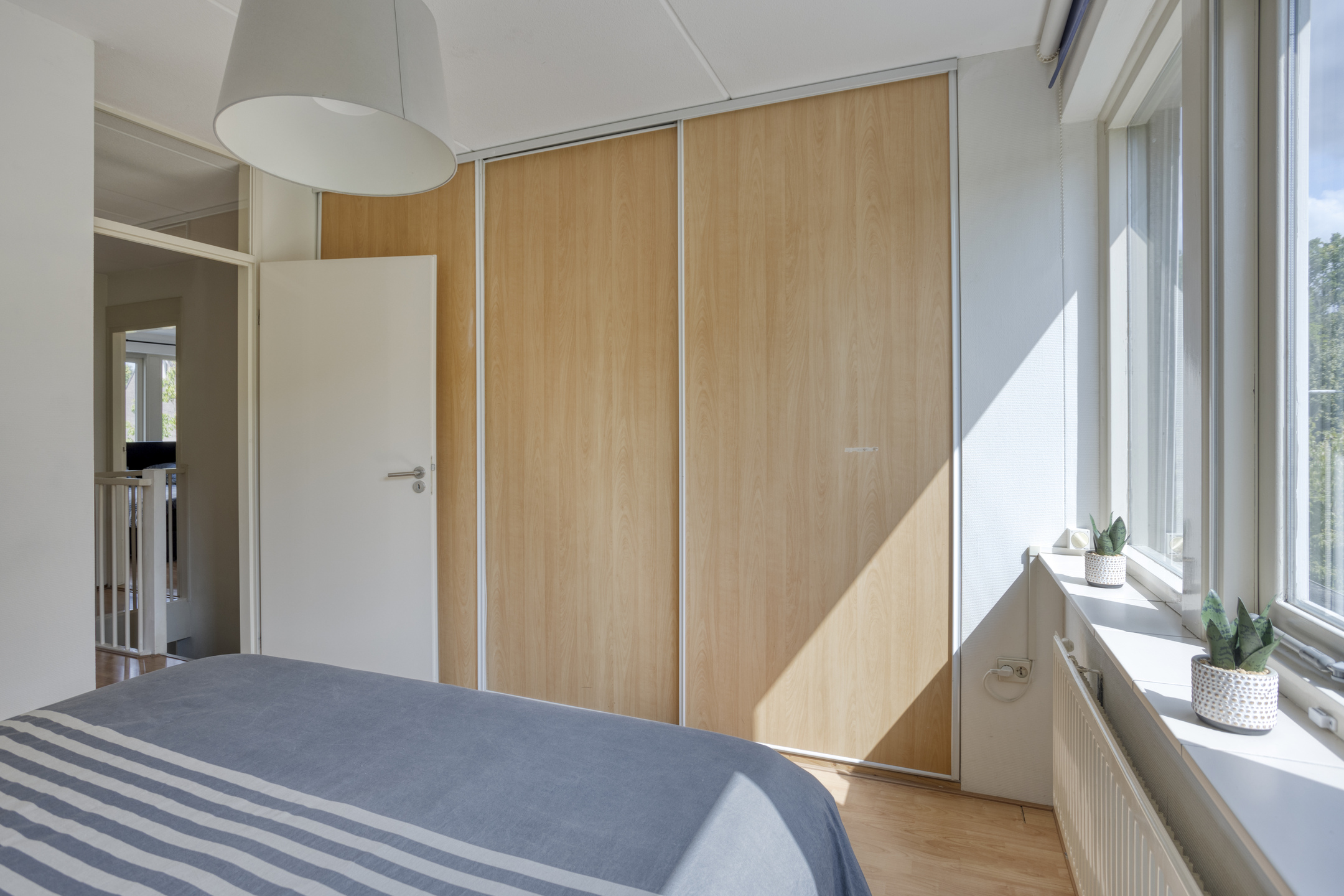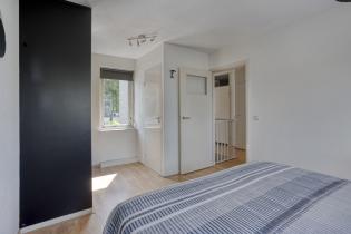 De eerste slaapkamer (ca. 10 m2) is gelegen aan de voorzijde. De kamer is voorzien van een laminaatvloer, een elektrisch rolluik en een vaste kast met schuifdeuren.