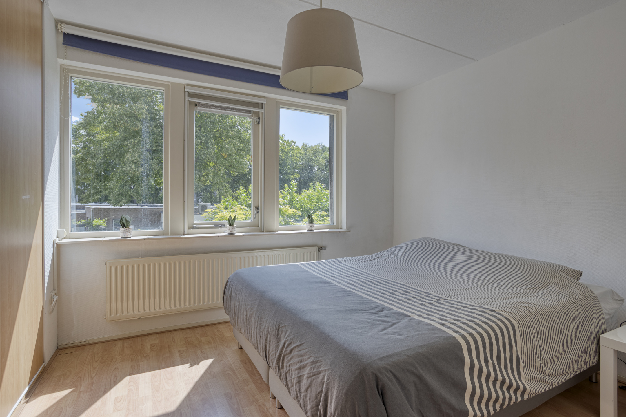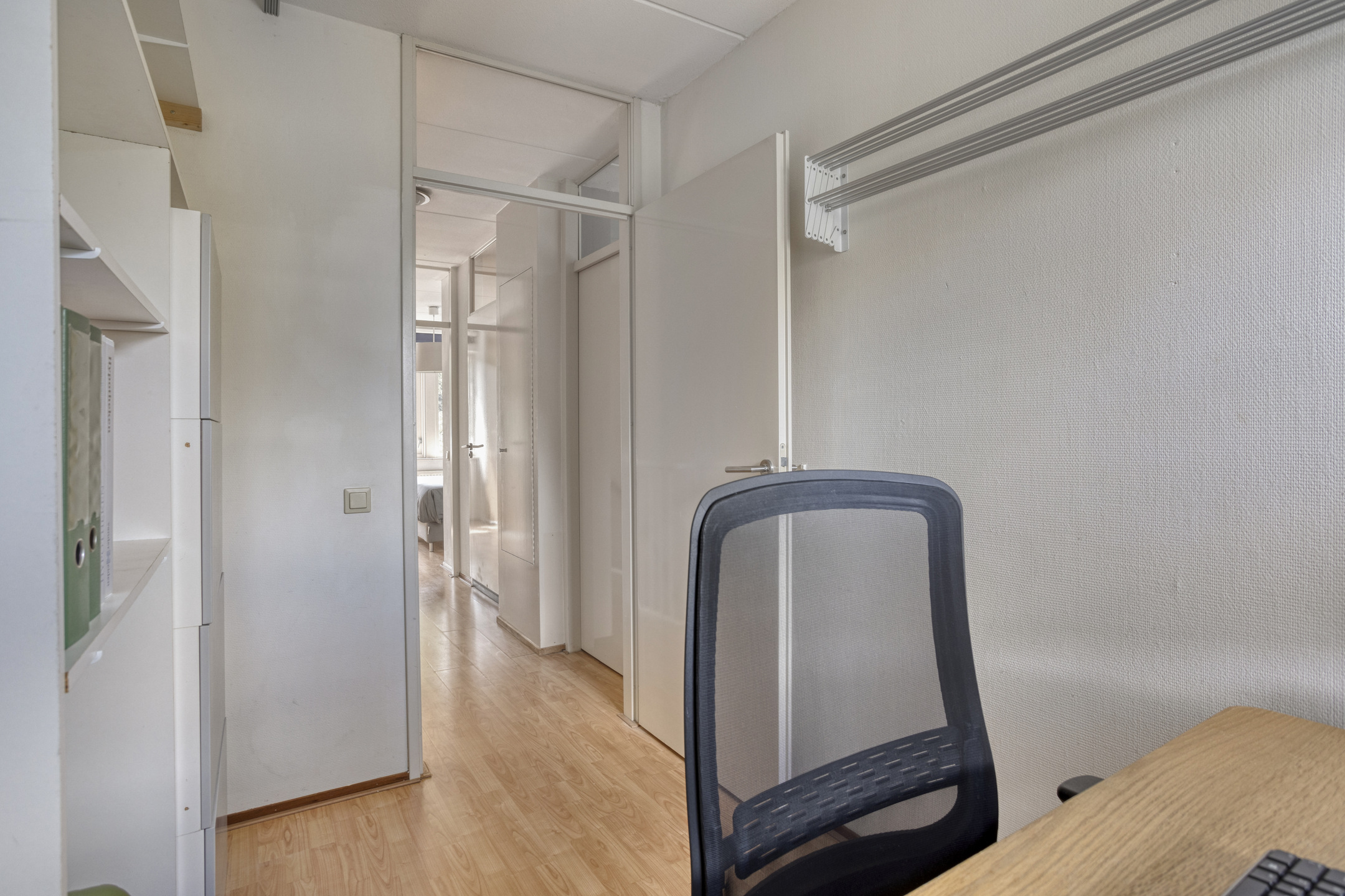 The third (approx. 8 m²) and fourth (approx. 5 m²) bedrooms are also located at the rear. These rooms are multifunctional and can easily be combined into one larger bedroom. They share a shutter and feature neat laminate flooring.