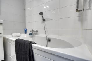 De laatste vanuit de overloop bereikbare ruimte is de badkamer. Deze moderne ruimte is volledig betegeld en voorzien van alle benodigdheden. Zo beschikt de badkamer over een ligbad, een wastafel in meubel, zwevend closet en een inloopdouche met regendouche-installatie.