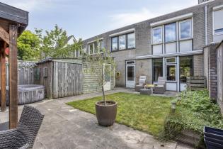 De loopdeur in de keuken biedt toegang tot de achtertuin op het Westen. De achtertuin is direct aan de woning voorzien van een ruim terras met zonneluifel. De bestrating loopt langs een gazon en borders met vaste beplanting door naar de achterzijde, waar een tweede terras is gesitueerd. Hier is tevens een zeer fraaie overkapping met veel ruimte voor een sfeervol lounge gedeelte.