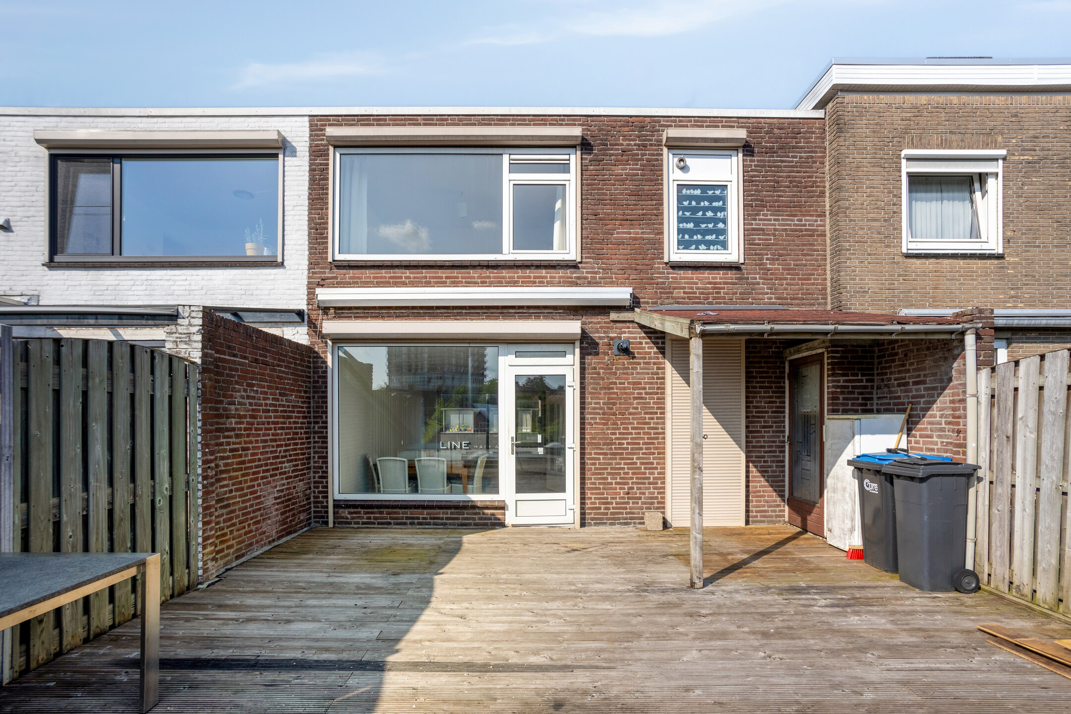The very spacious roof terrace can be accessed from both the living room and the utility room. Facing southwest, it enjoys abundant sunlight. The terrace is finished with decking, a sun awning and a covered section directly against the rear façade.