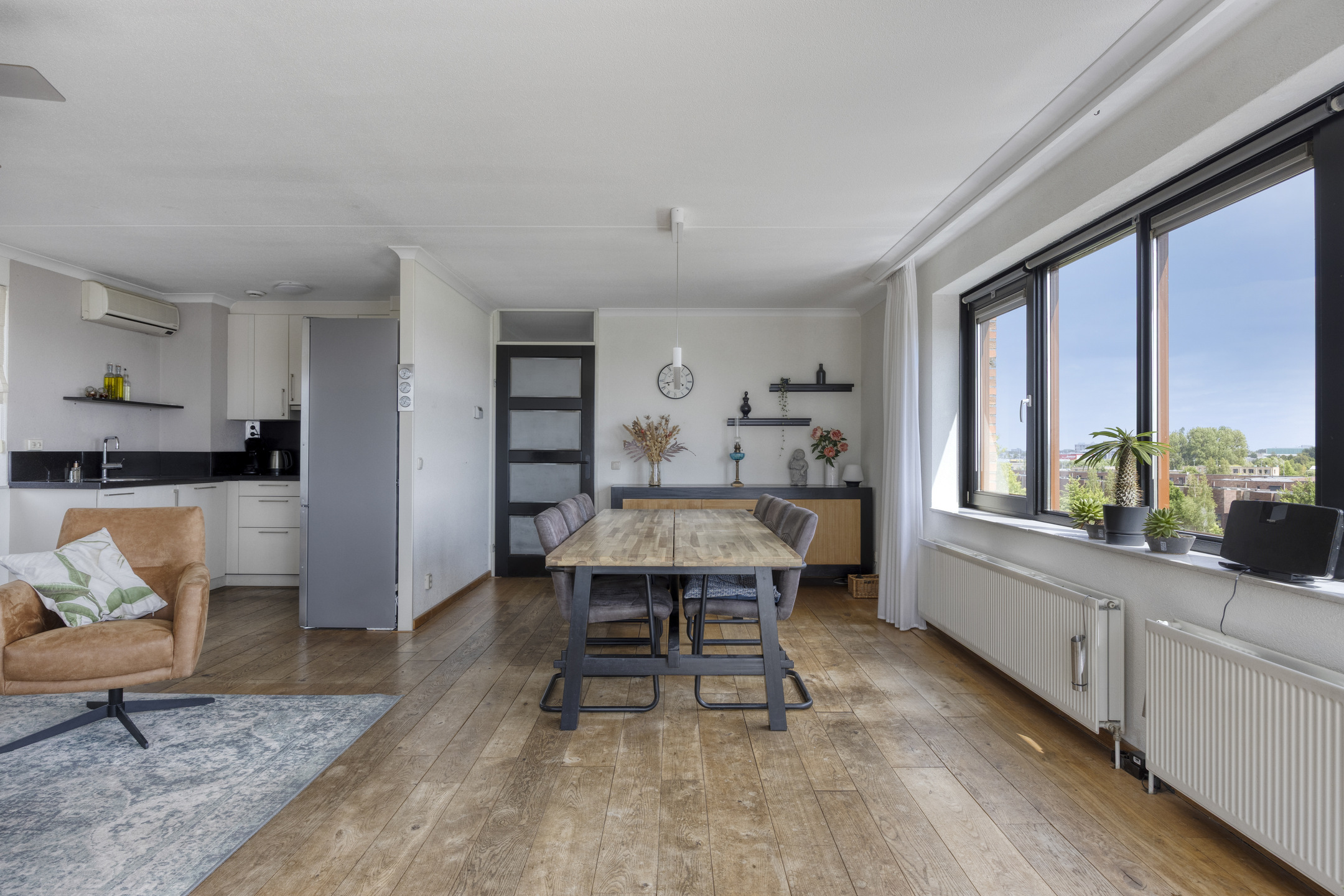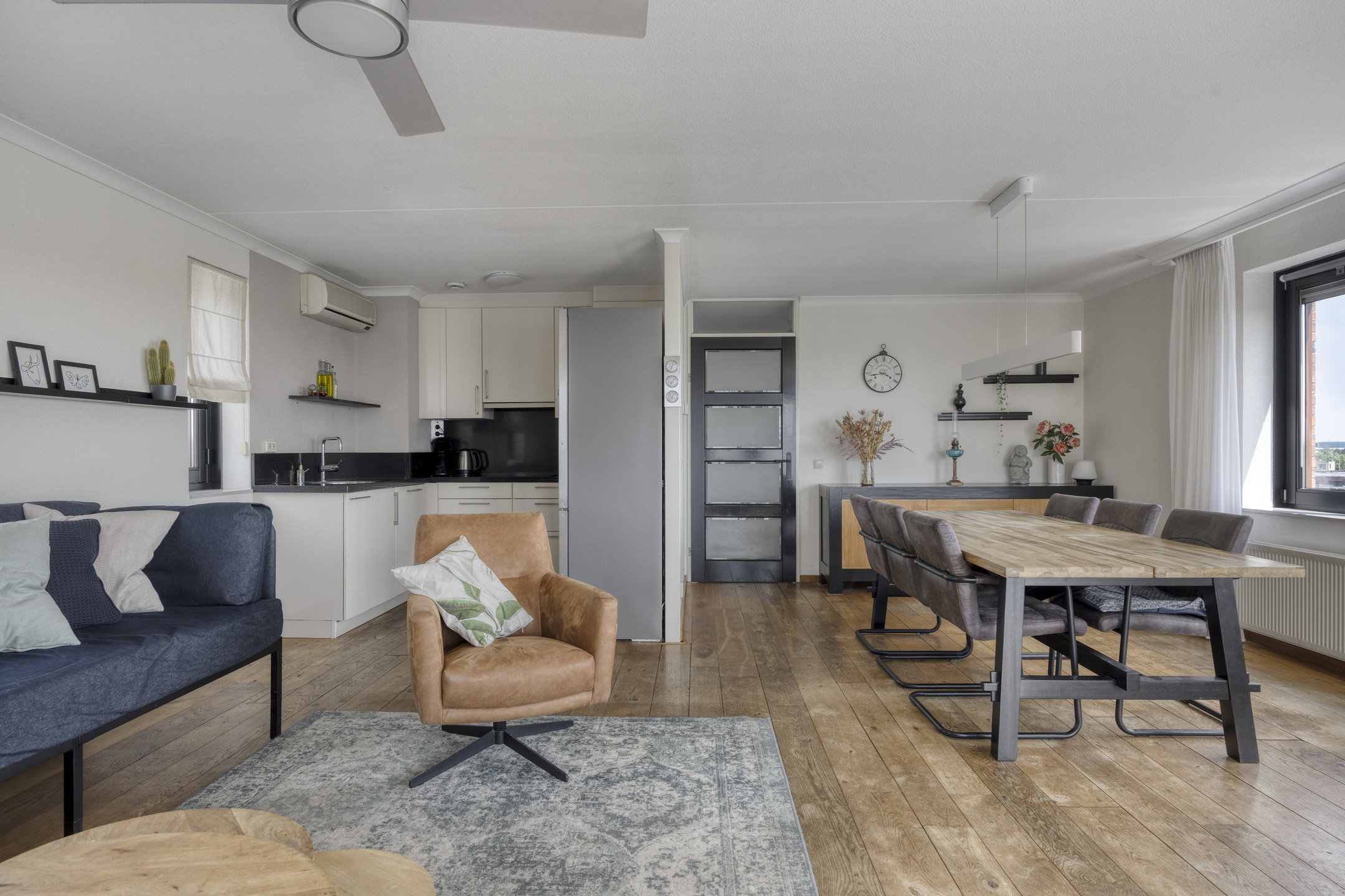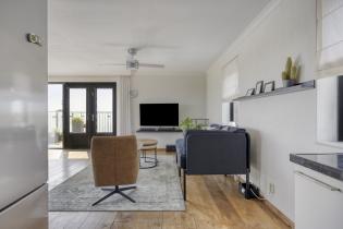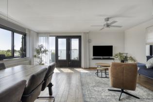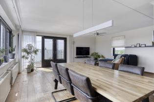 De woonkamer is royaal (circa 43 m² inclusief keuken) en geniet van een uitzonderlijke lichtinval door ramen aan drie zijden. De ruimte is sfeervol afgewerkt met een houten vloer, strakke wanden en een spuitwerk plafond. Voor extra comfort is er een airco geïnstalleerd. Via dubbele deuren is het heerlijke dakterras van circa 12 m² bereikbaar, de perfecte plek om van het uitzicht en de zon te genieten. Zonwerende screens houden de warmte op warme dagen buiten.