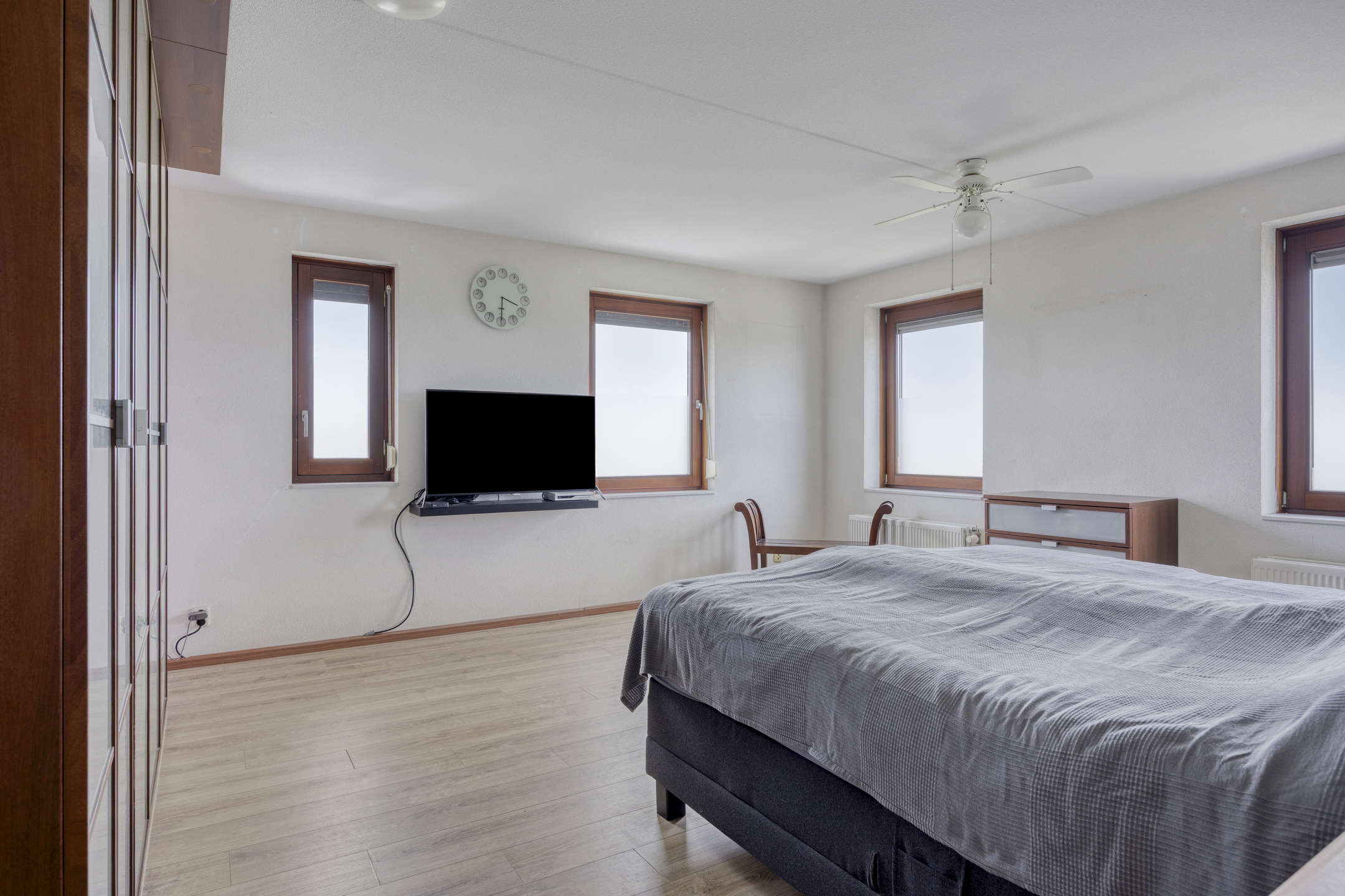 De hoofdslaapkamer is een royale master bedroom van circa 23 m² met een laminaatvloer, strakke wandafwerking en spuitwerk plafond.