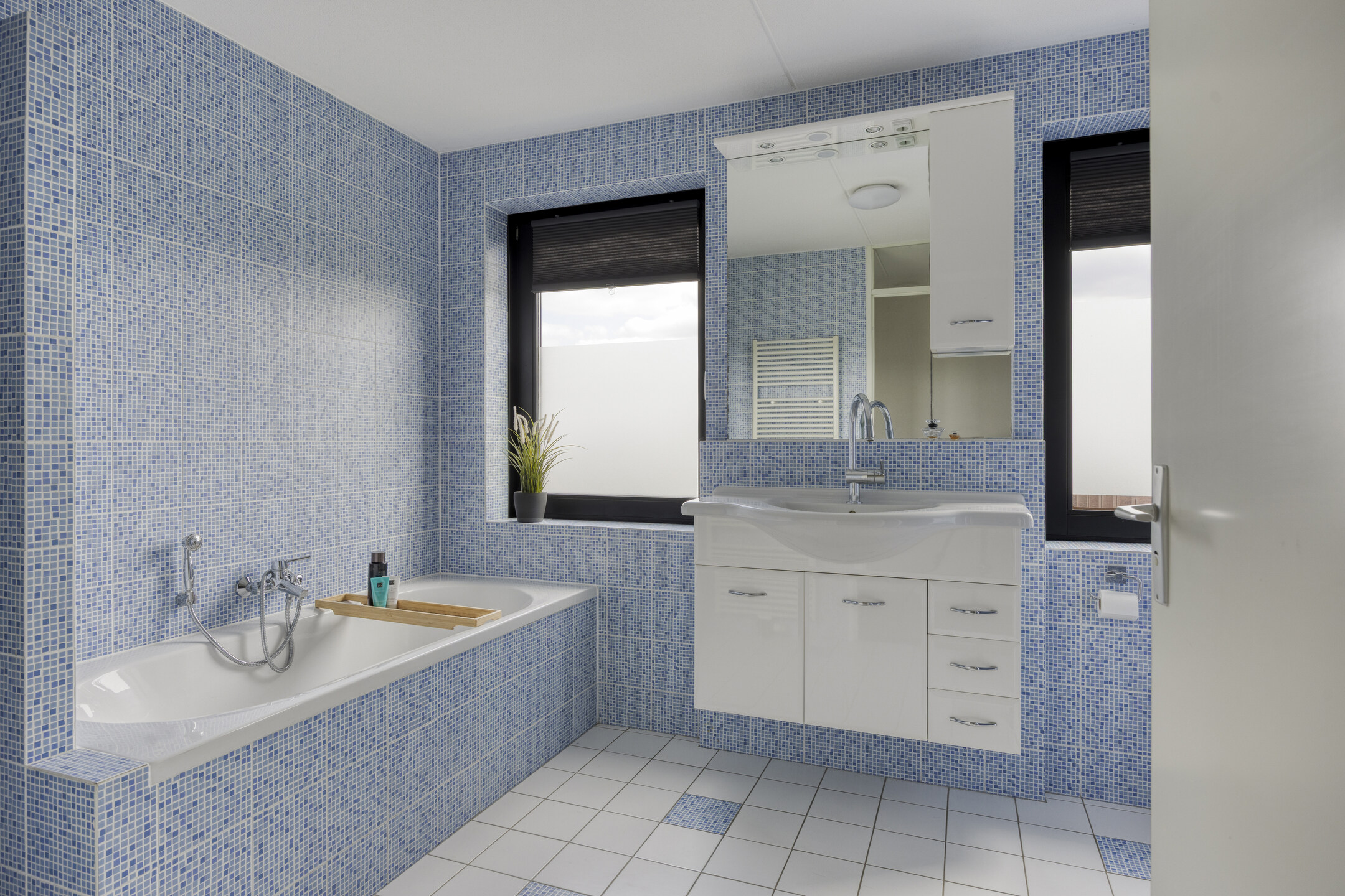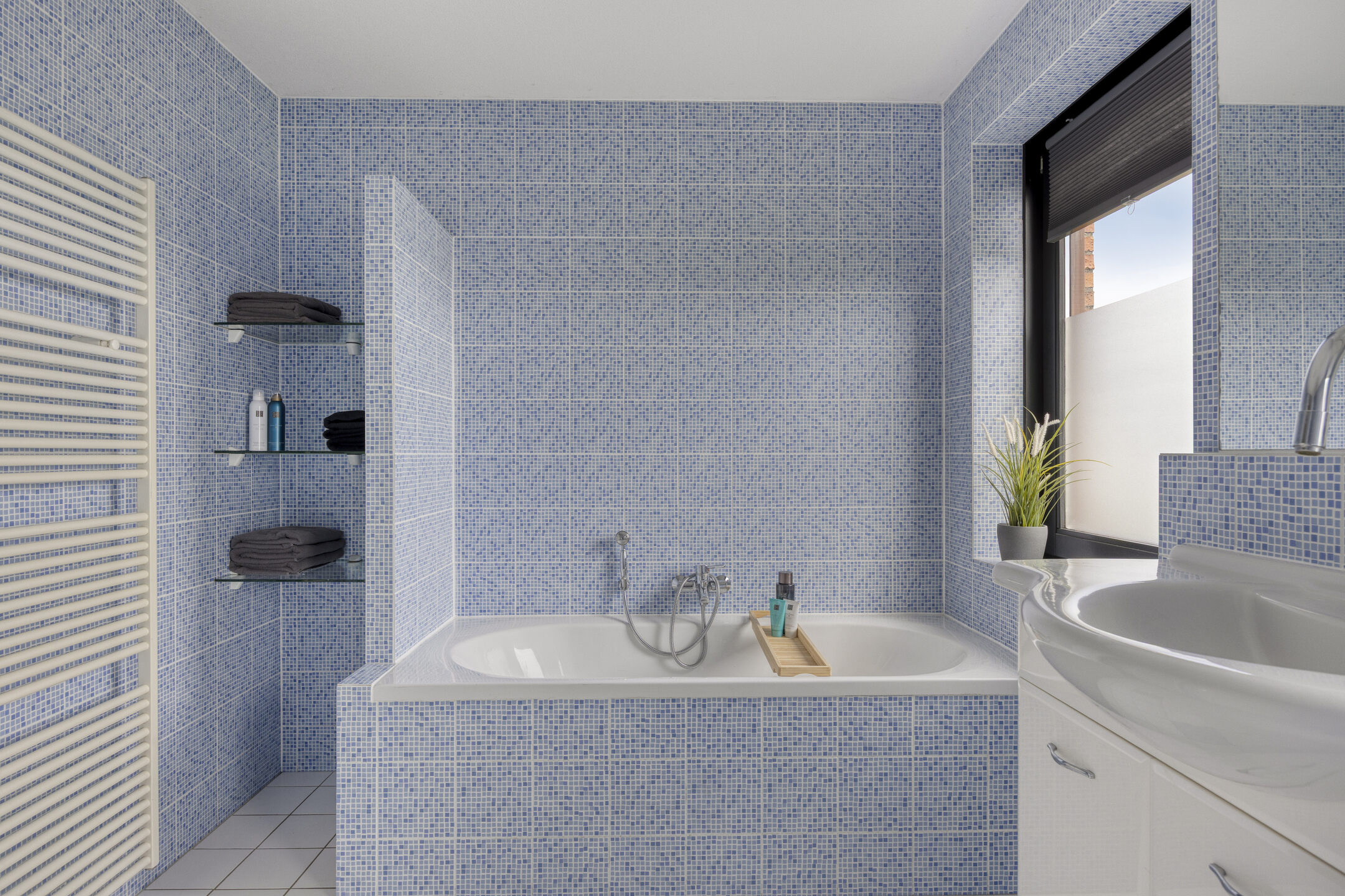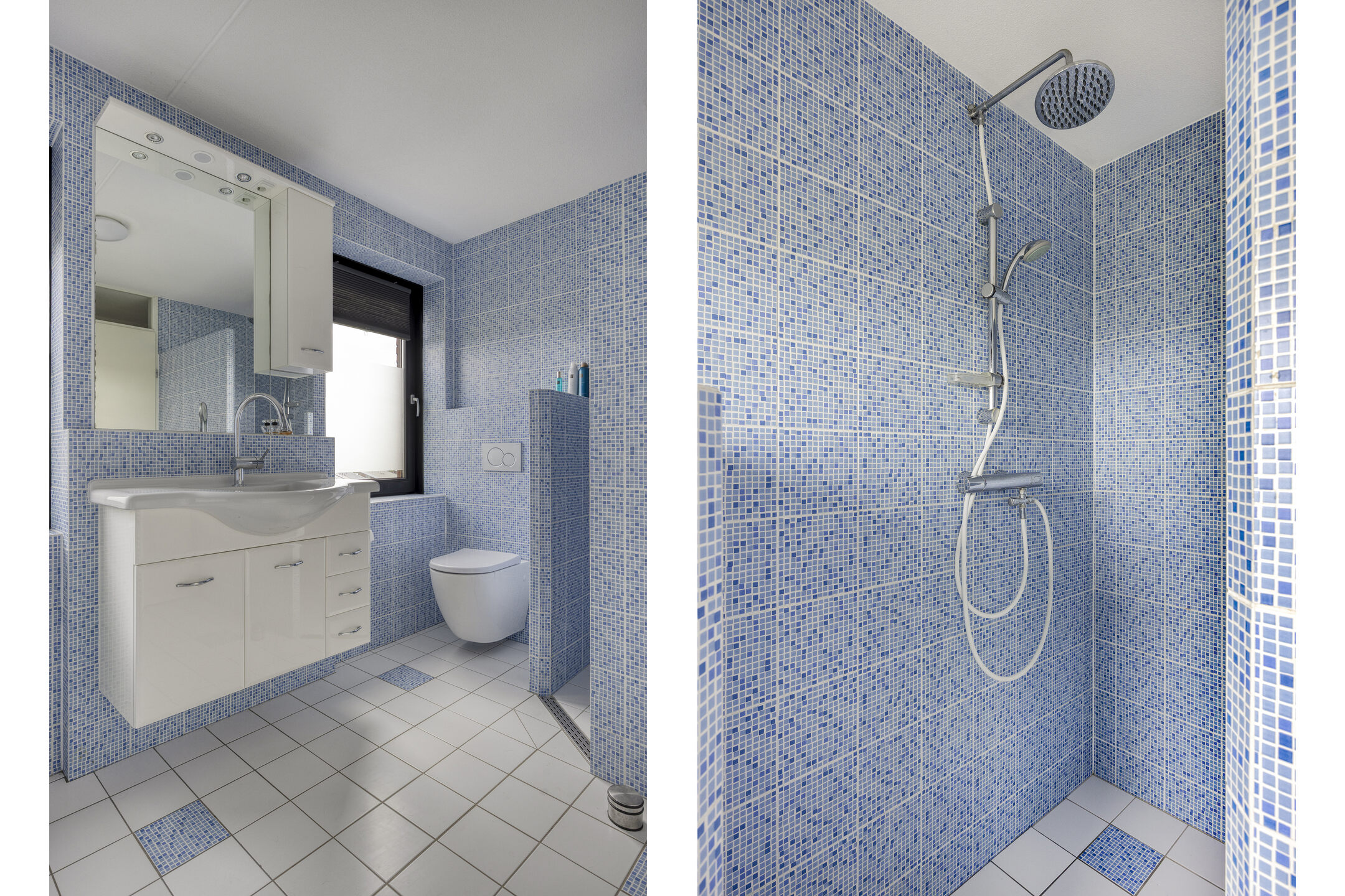 De badkamer is volledig betegeld en beschikt over een ligbad, inloopdouche, wastafelmeubel en een tweede toilet.