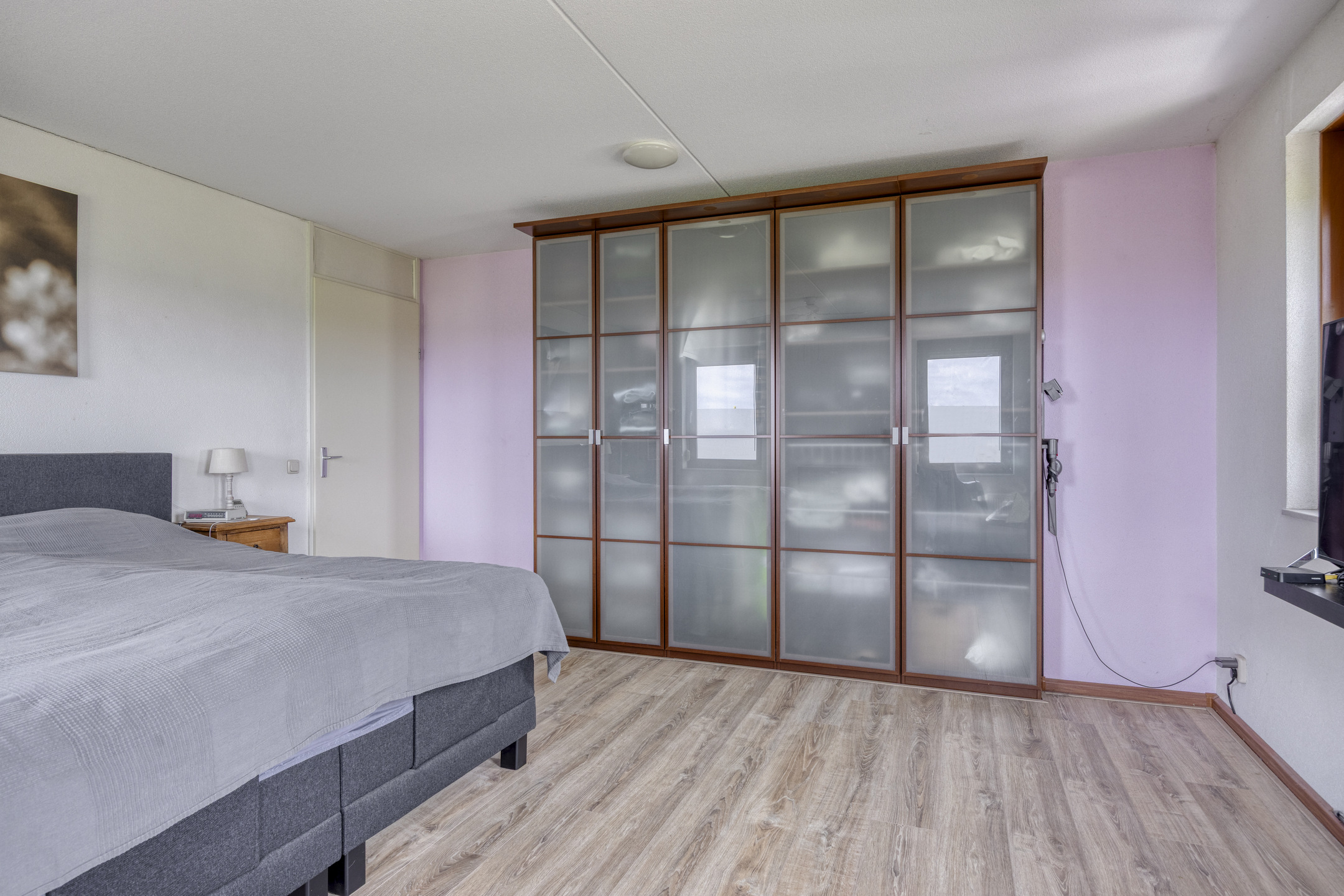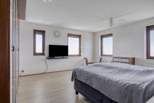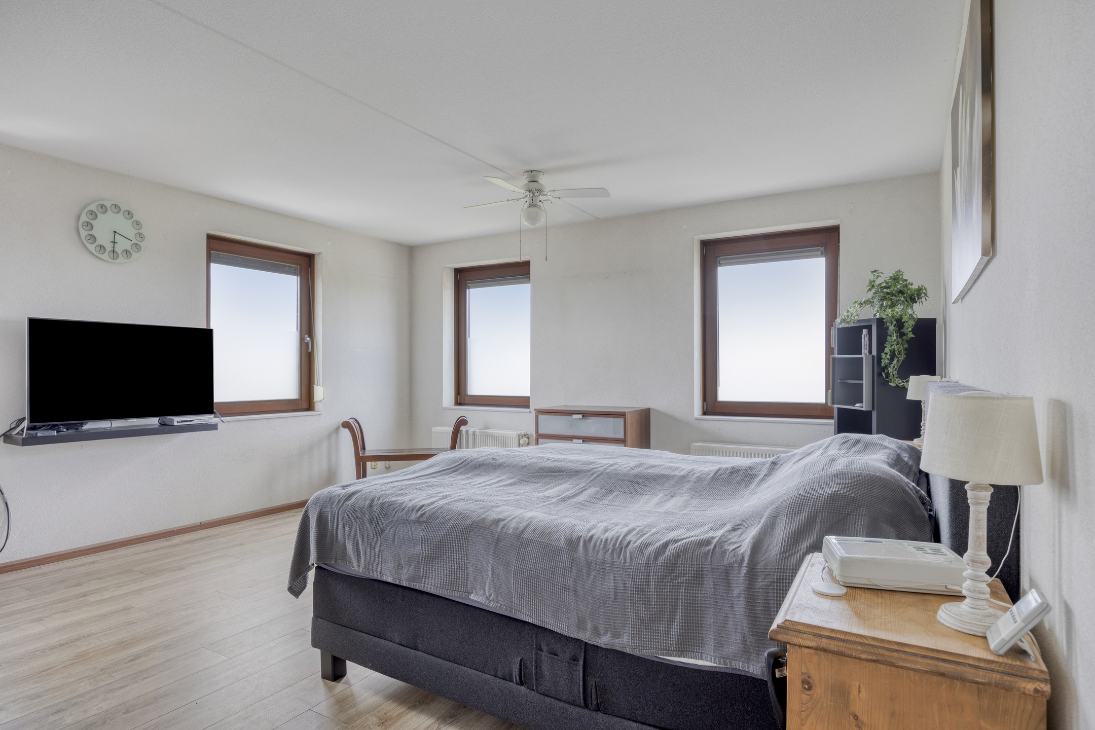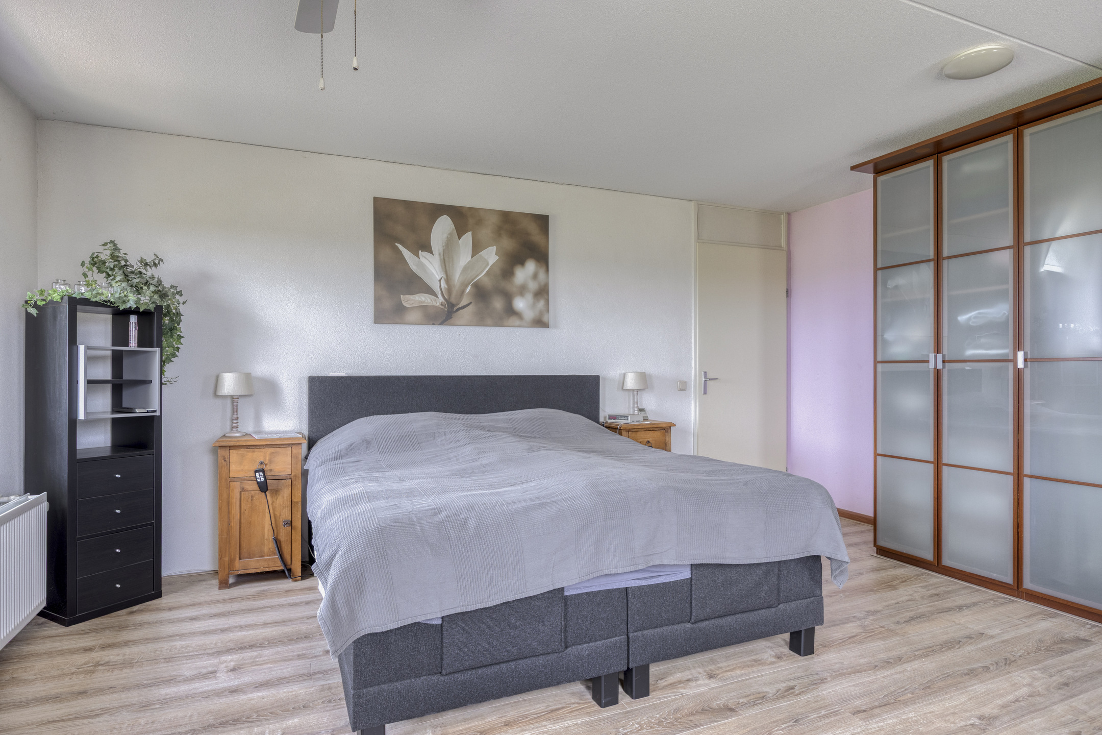 De hoofdslaapkamer is een royale master bedroom van circa 23 m² met een laminaatvloer, strakke wandafwerking en spuitwerk plafond.