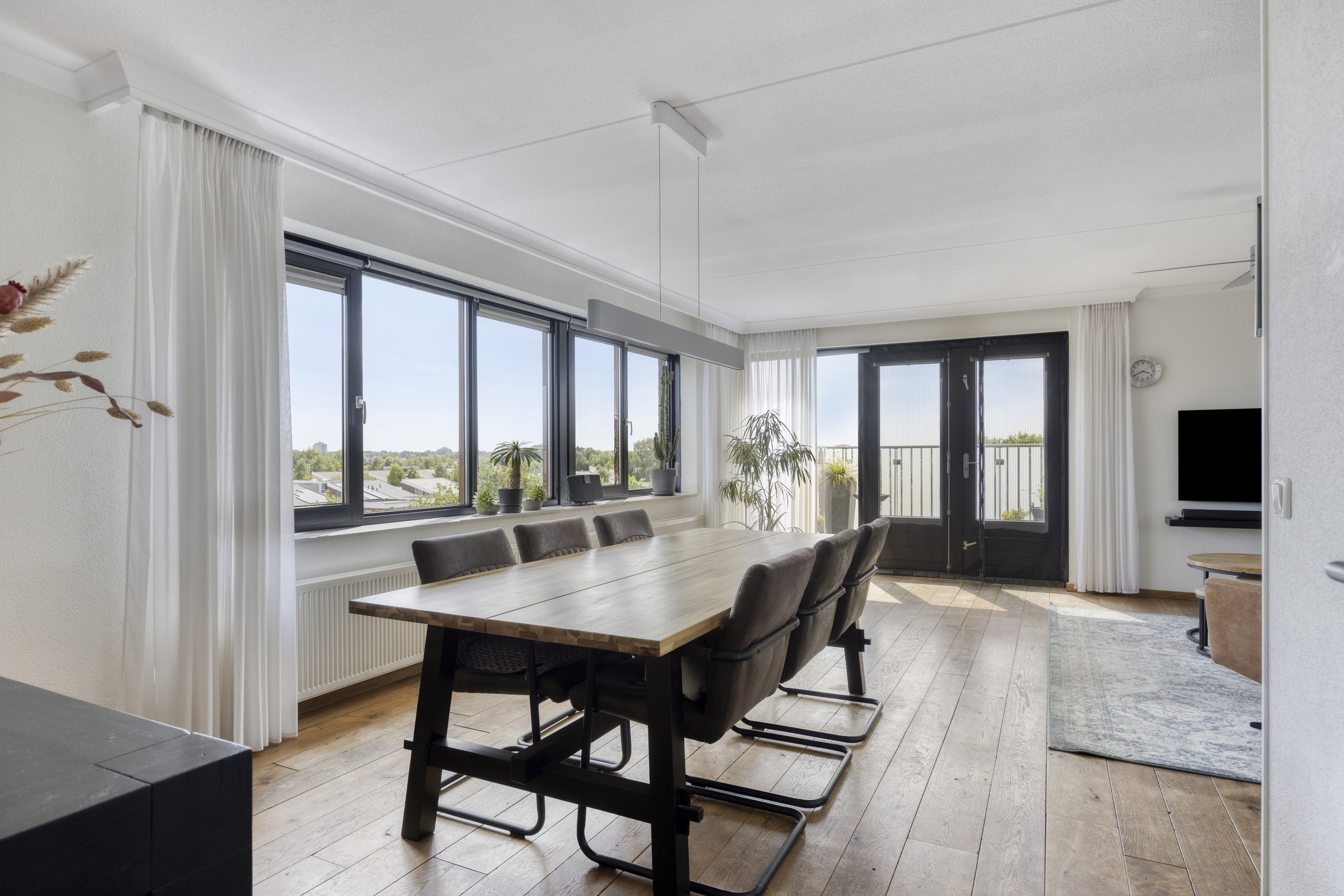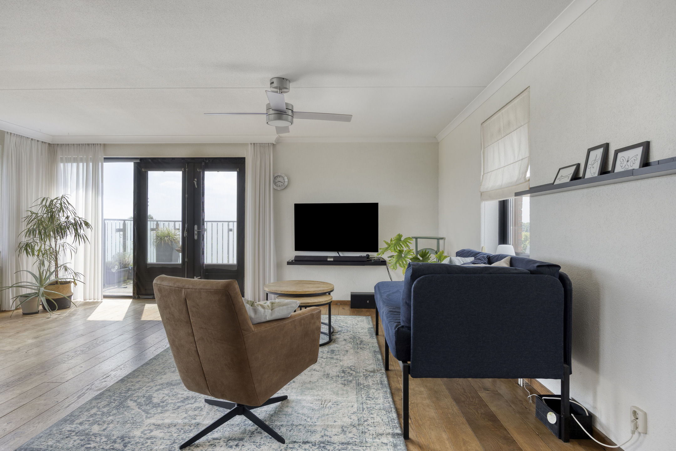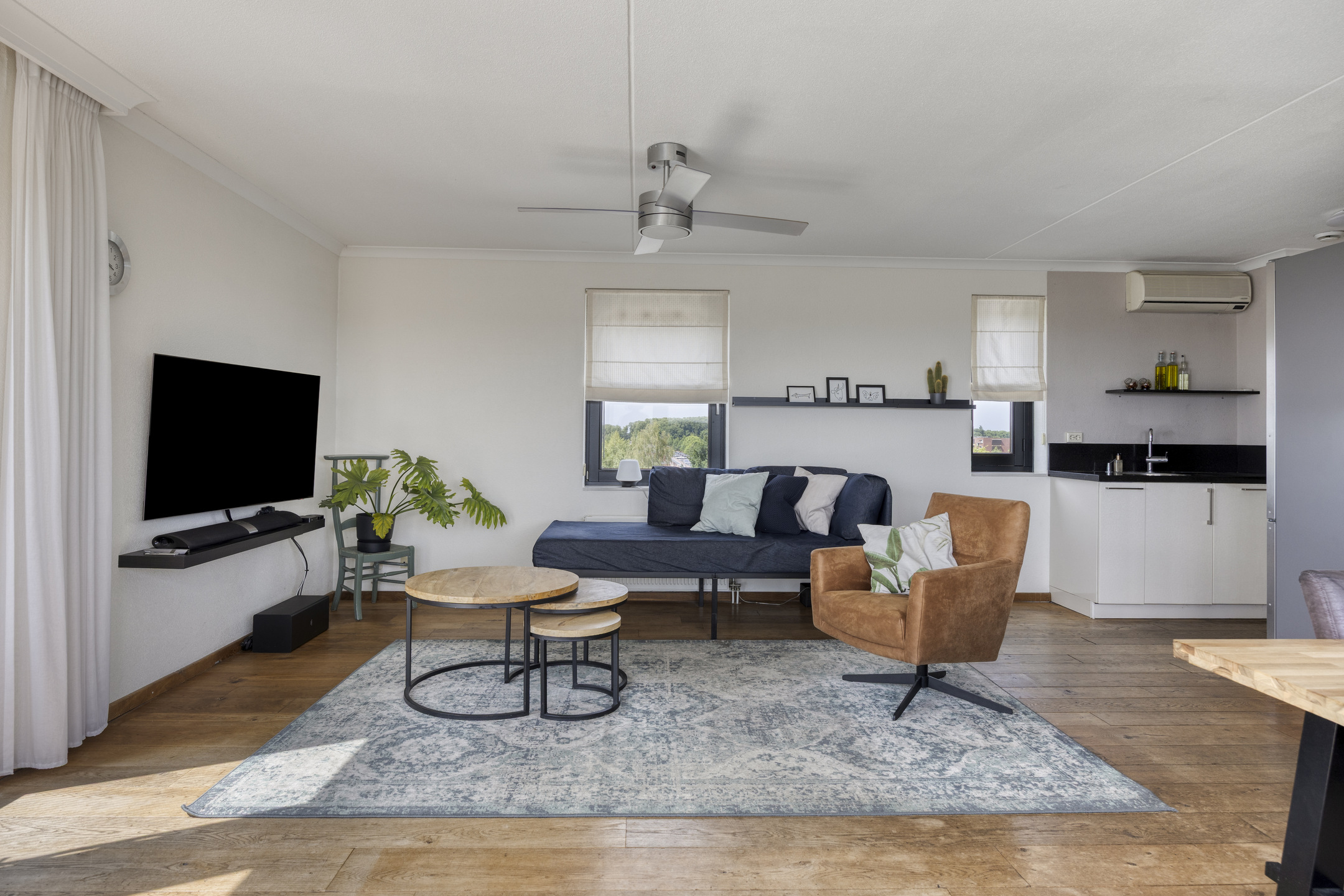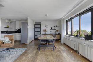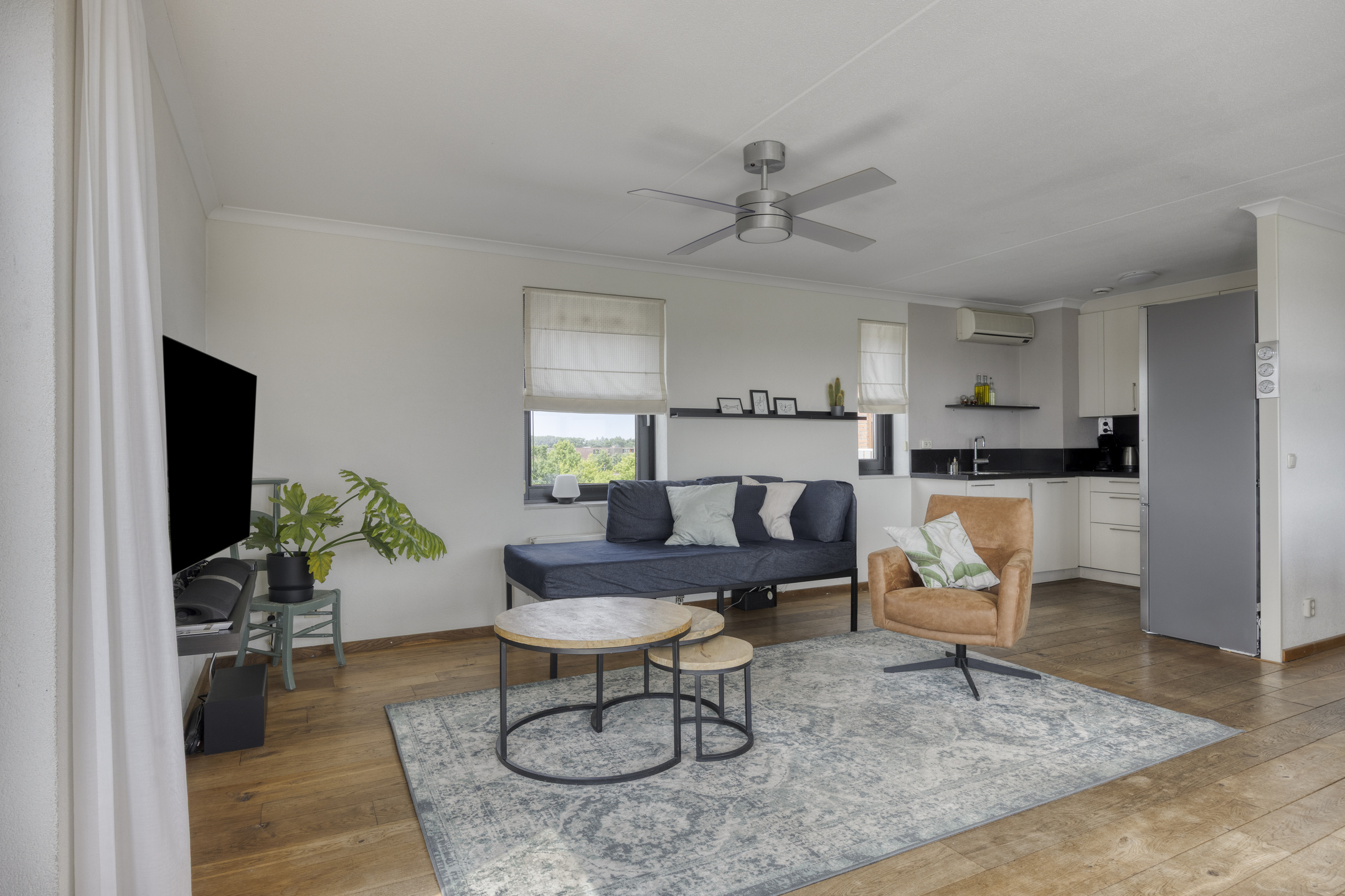 De woonkamer is royaal (circa 43 m² inclusief keuken) en geniet van een uitzonderlijke lichtinval door ramen aan drie zijden. De ruimte is sfeervol afgewerkt met een houten vloer, strakke wanden en een spuitwerk plafond. Voor extra comfort is er een airco geïnstalleerd. Via dubbele deuren is het heerlijke dakterras van circa 12 m² bereikbaar, de perfecte plek om van het uitzicht en de zon te genieten. Zonwerende screens houden de warmte op warme dagen buiten.