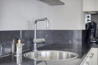 De open keuken is modern en van alle gemakken voorzien, waaronder een vaatwasser, combi-oven, elektrische kookplaat, afzuigkap, koelkast, mechanische ventilatie, een granieten werkblad en veel kastruimte.
