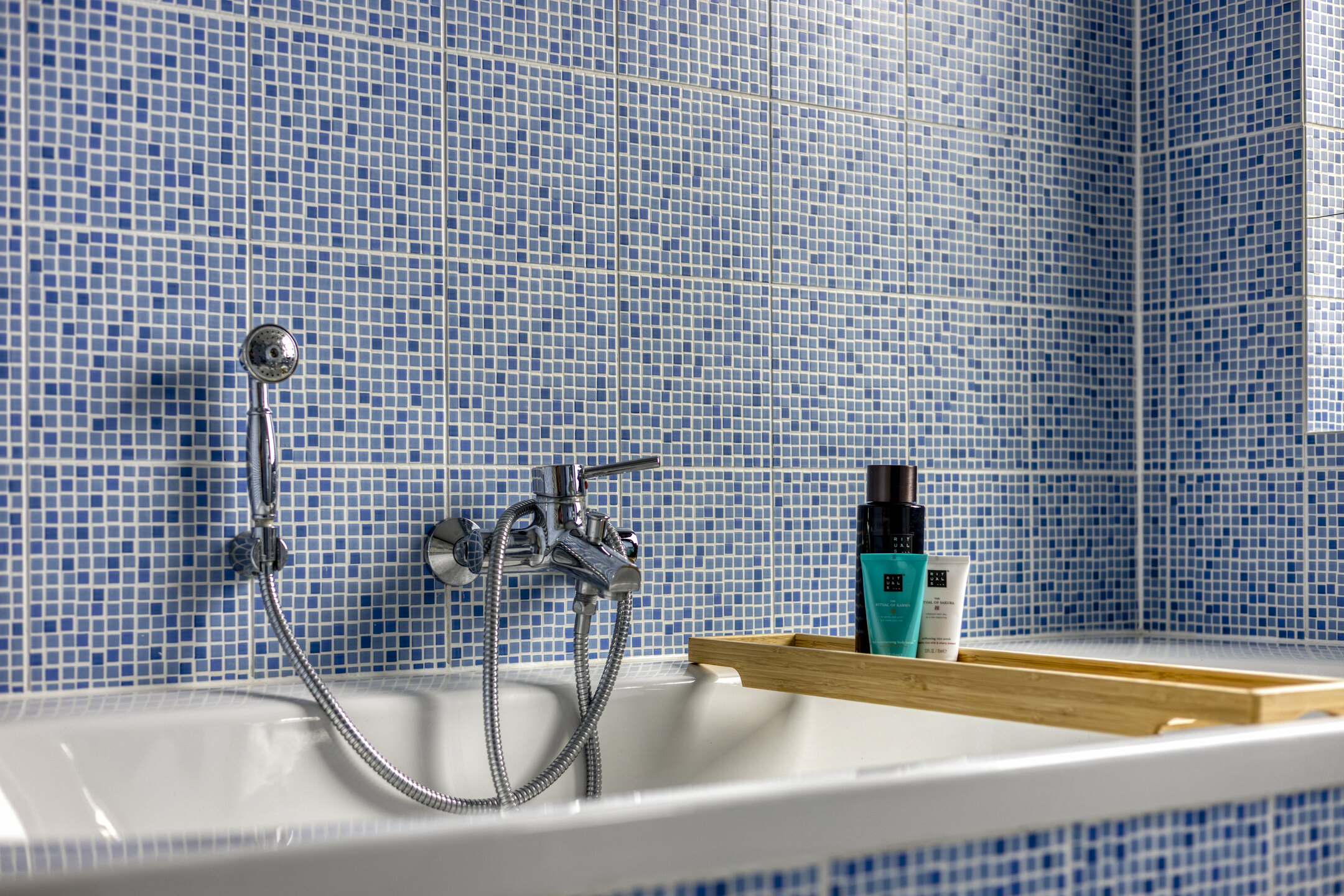 The bathroom is fully tiled and includes a bathtub, walk-in shower, vanity unit, and a second toilet.