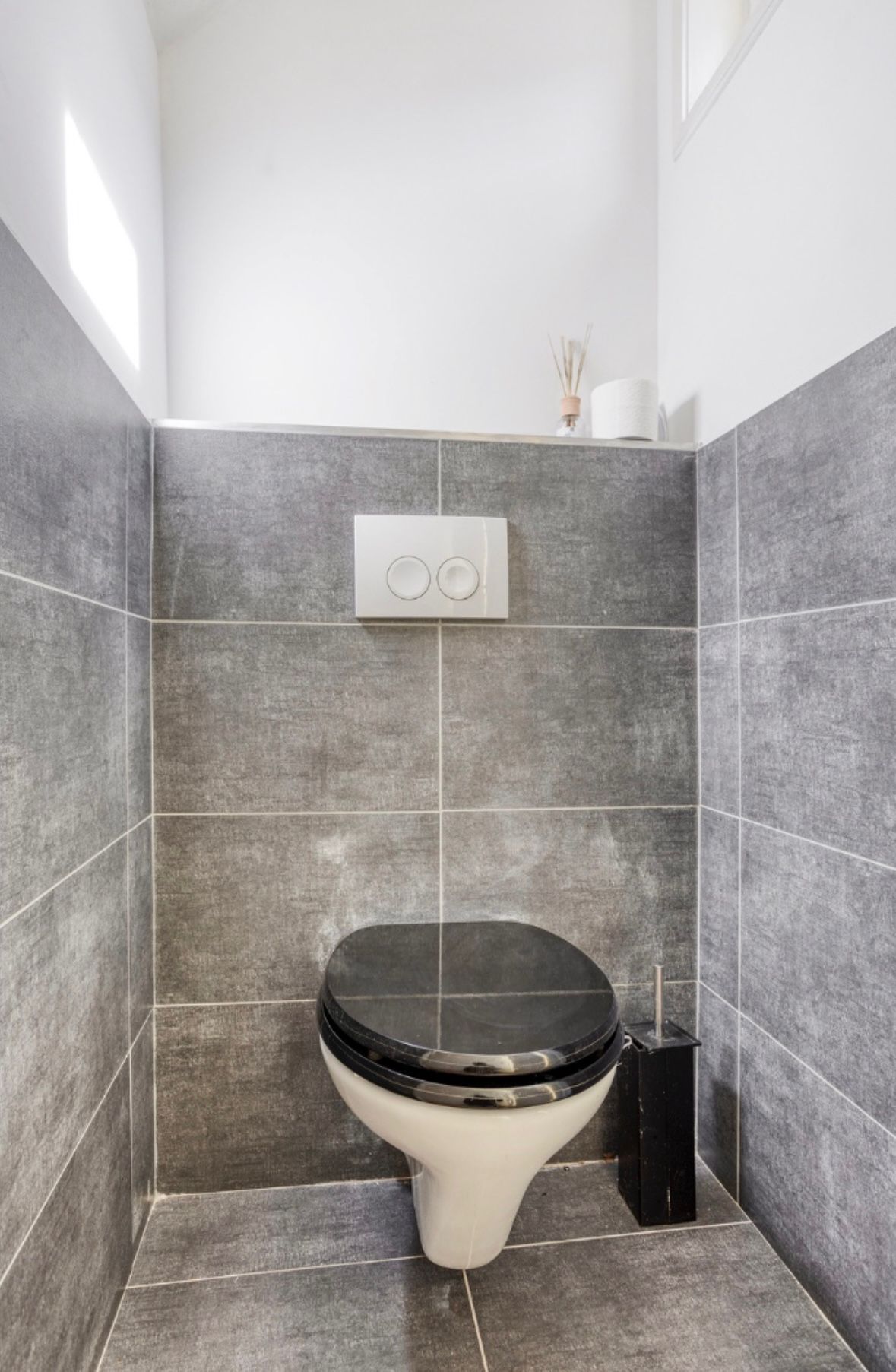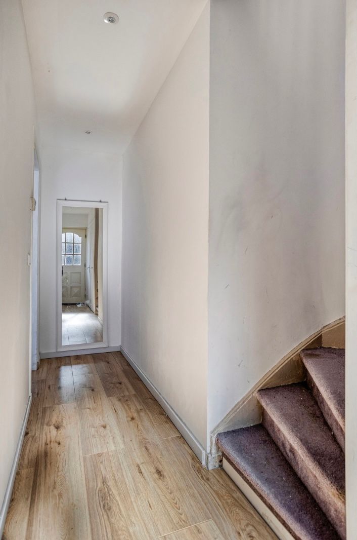 You enter the house through the front garden. The hallway provides access to the staircase, a practical storage cupboard with updated fuse box, and a modern toilet with wall-mounted WC.