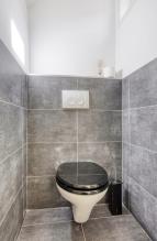 De royale badkamer is half betegeld en uitgerust met een ligbad, douche, wastafelmeubel met een moderne waskom en een designradiator. Het geheel is grotendeels uitgevoerd met moderne lichtgrijze betegeling. Tevens bevindt zich hier de wasmachineaansluiting.