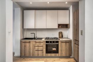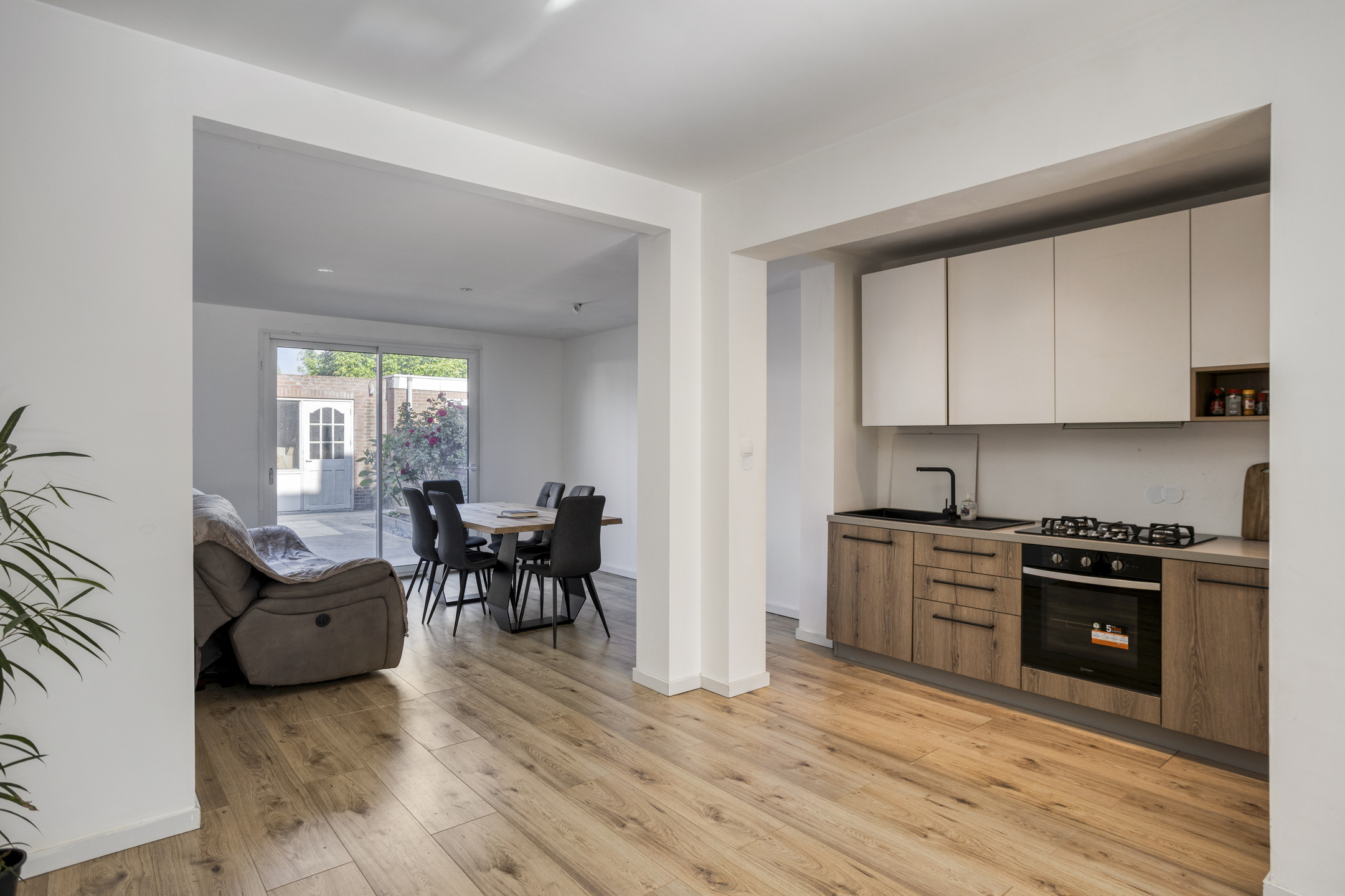 De moderne open keuken ligt centraal in de living en is afgewerkt met een vernieuwde houtlook keukeninrichting met een spoelbak, 5-pits gaskookplaat, afzuigkap, oven, koelkast en vriezer.