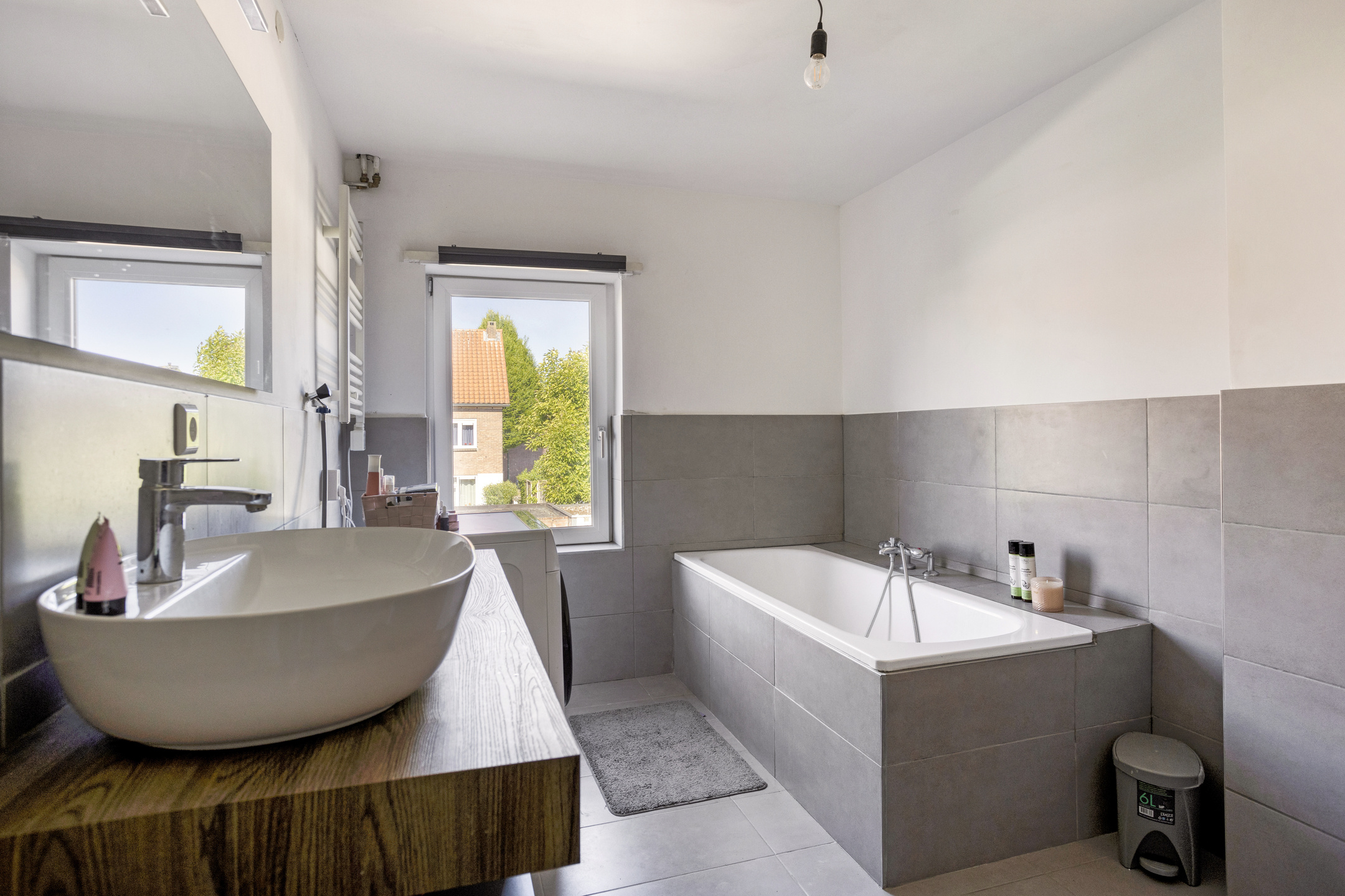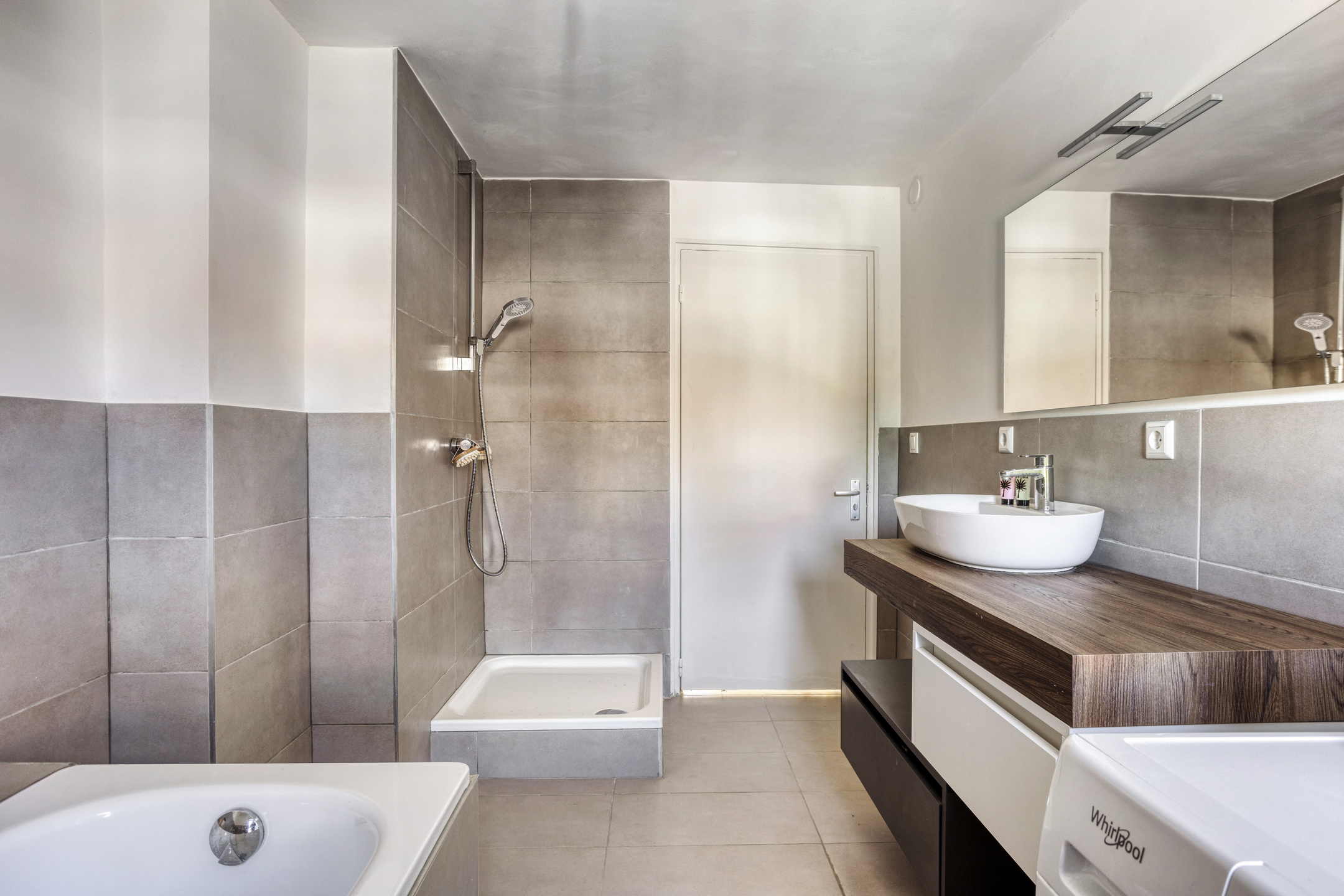 The spacious bathroom is half-tiled and equipped with a bathtub, separate shower, washbasin with modern countertop sink, and a designer radiator. Most of the walls are finished with modern light grey tiles. The washing machine connection is also located here.