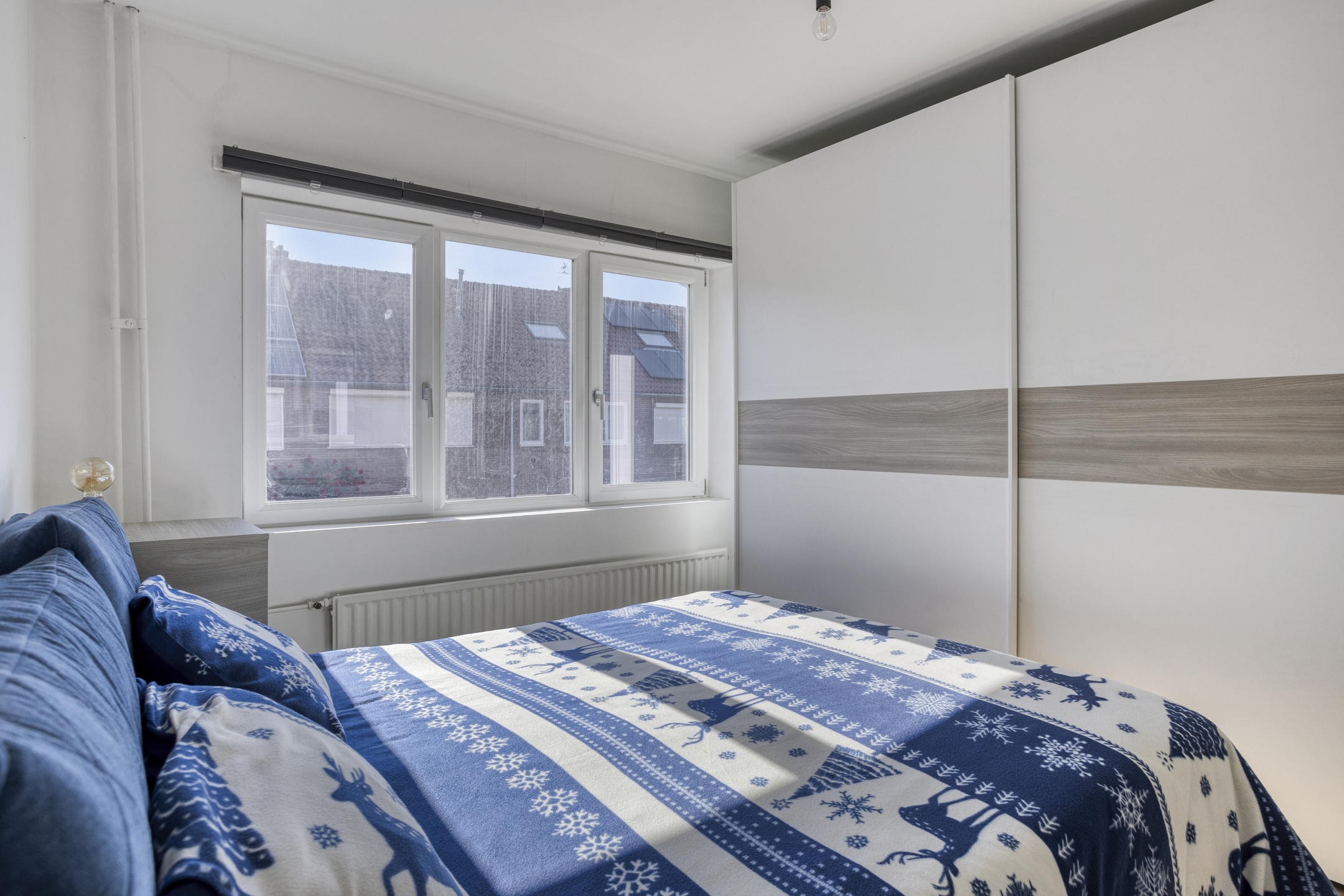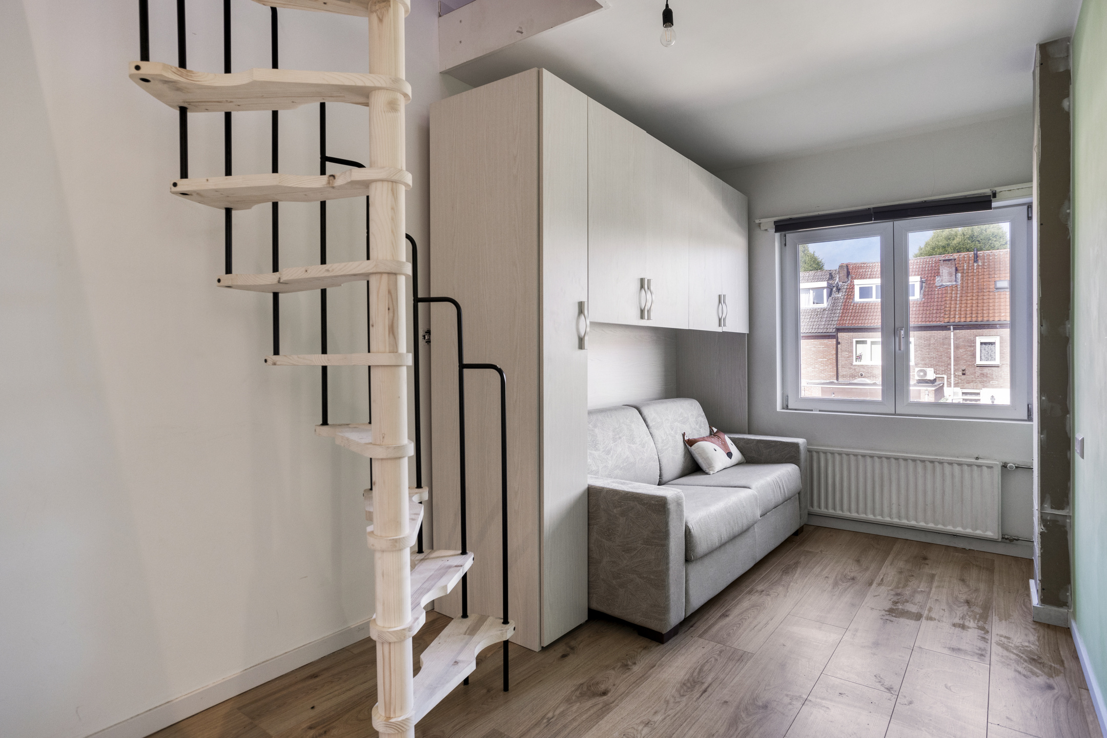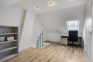 A fixed staircase from bedroom 2 leads to the large attic bedroom (approx. 11 m²) with a roof window. There is also a separate storage space with the central heating boiler (Atag, year 2011).