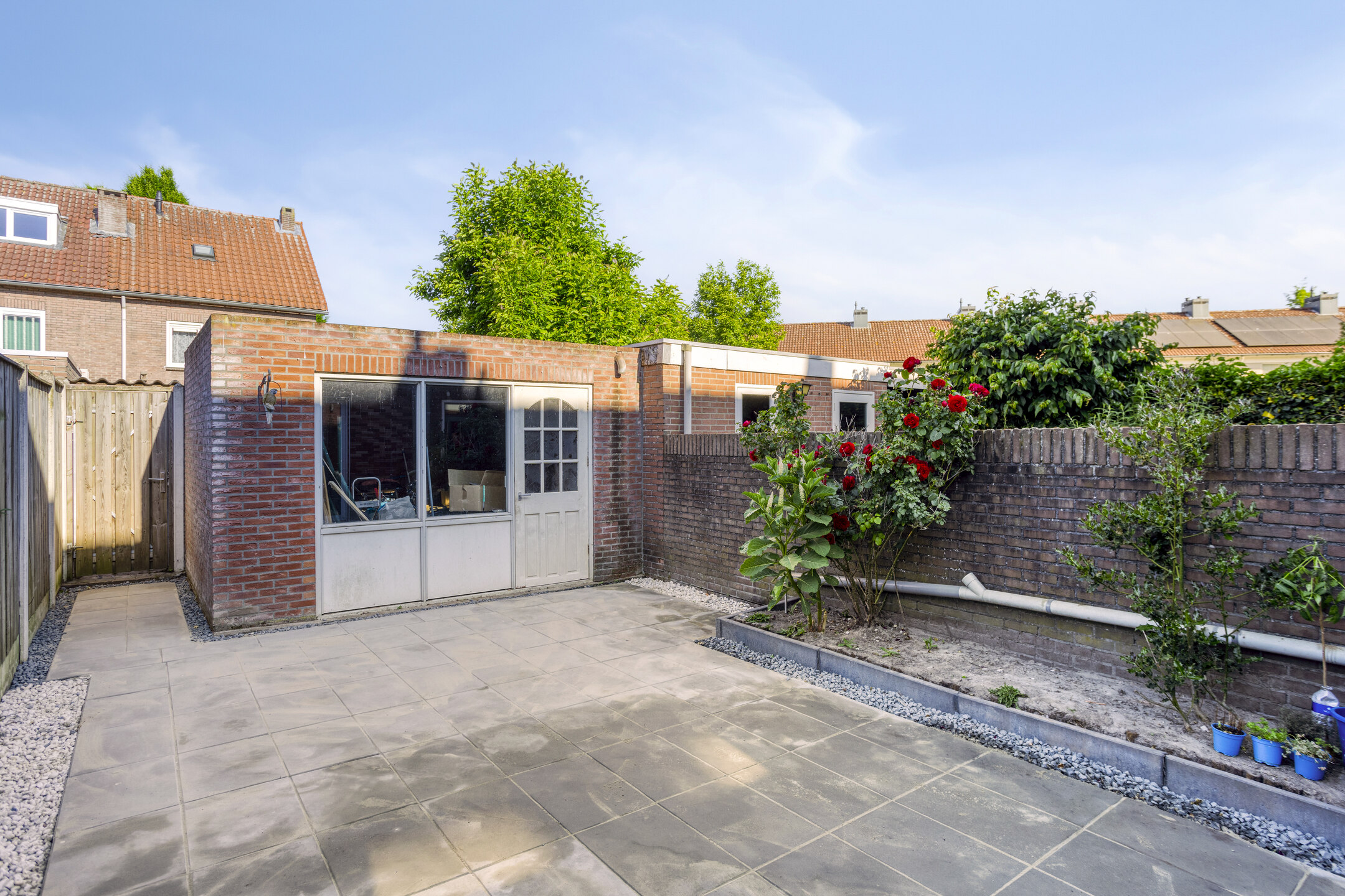 De achtertuin ligt op het westen en is netjes aangelegd met sierbestrating, een plantenborder en een praktische achterom. Achterin de tuin staat een stenen berging voorzien van elektra.
