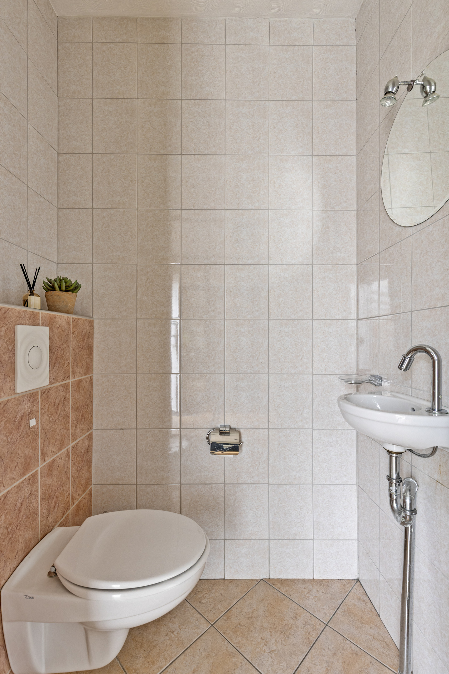 De toiletruimte is volledig betegeld en voorzien van een zwevend closet met een fonteintje.