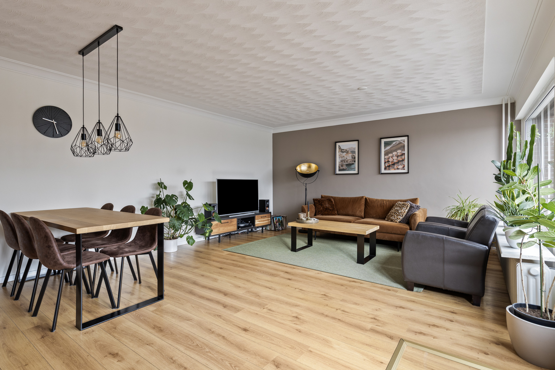 De ruime woonkamer is door de grote raampartij aan de voorzijde voorzien van veel daglicht toetreding. Verder beschikt de woonkamer over een nette laminaatvloer en openslaande tuindeuren naar de voortuin.