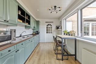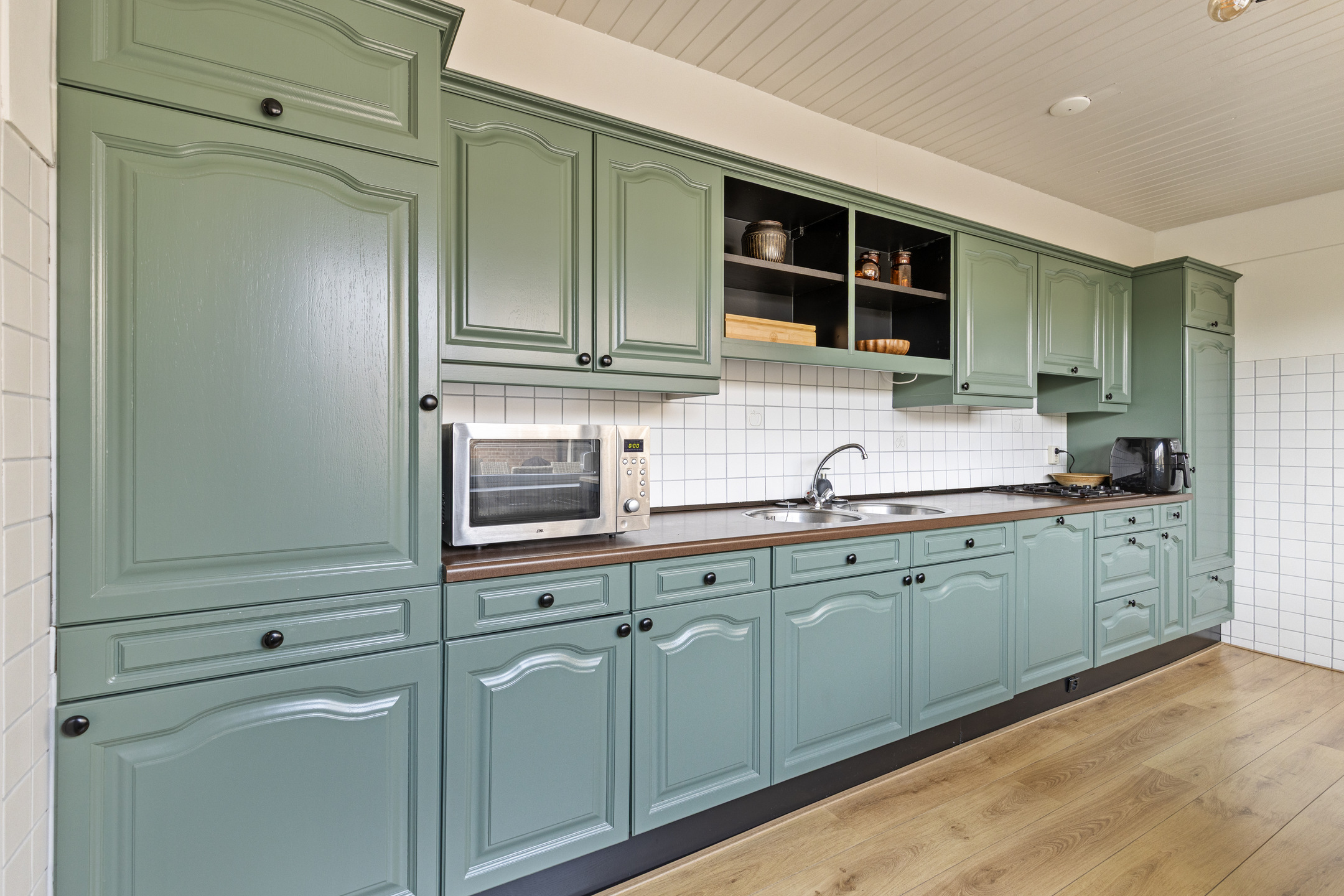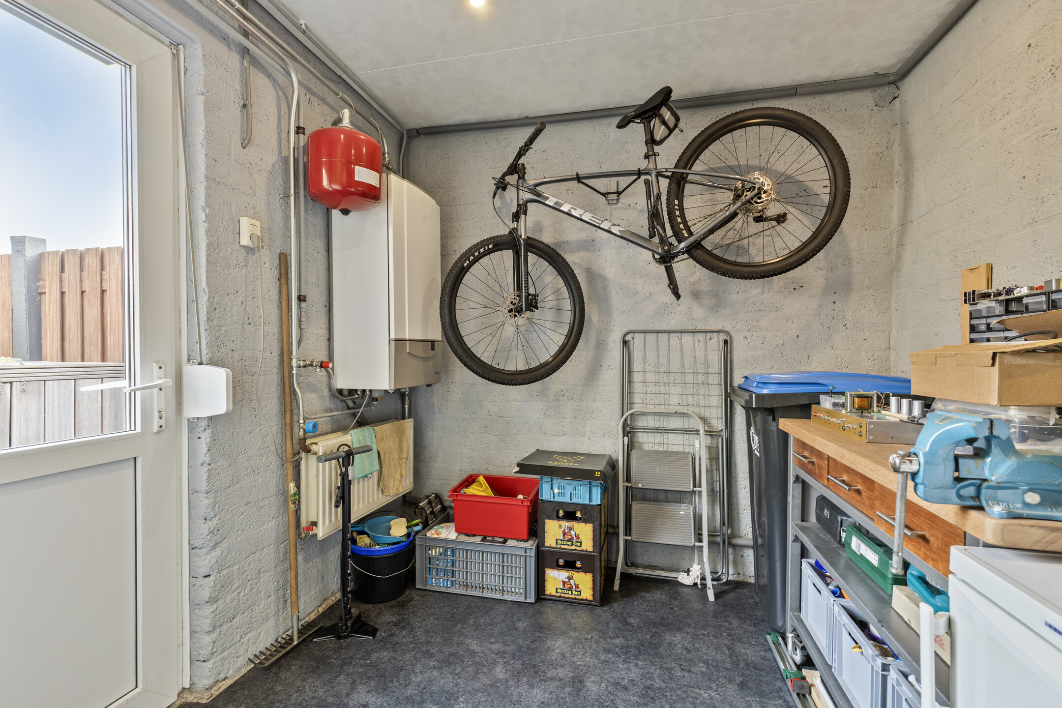 Aangrenzend treft u een praktische bijkeuken met pvc-vloer, inbouwspots en een tuindeur met rolluik. Verder beschikt deze berging over de opstelling C.V.-ketel en de vernieuwde meterkast met omvormer voor de tien zonnepanelen op het dak.