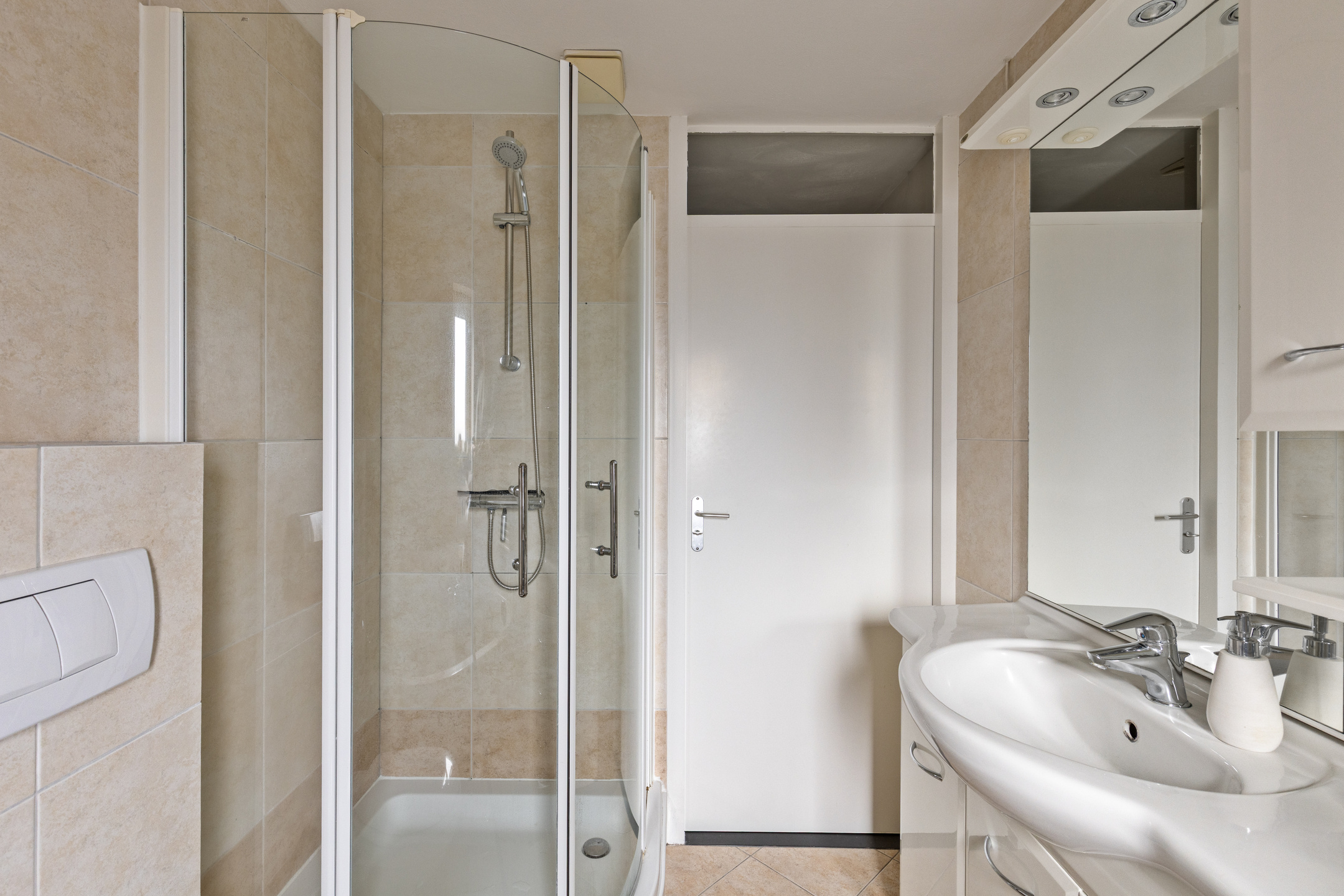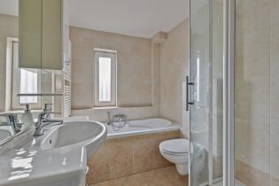 De badkamer is volledig betegeld en voorzien van een ligbad, een aparte douche met glazen deur, een wastafelmeubel met spiegelkast en een zwevend toilet. Verder is er een designradiator aanwezig en zorgt vloerverwarming voor extra comfort. Dankzij de ramen met matglas komt er prettig daglicht naar binnen, terwijl privacy gewaarborgd blijft.
