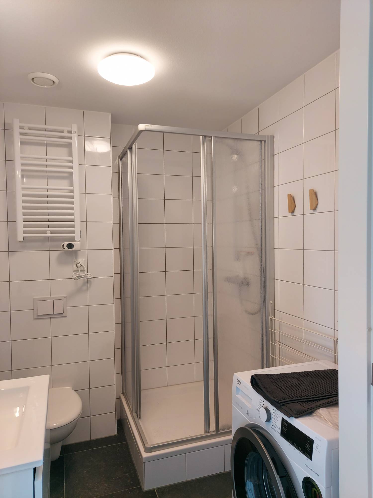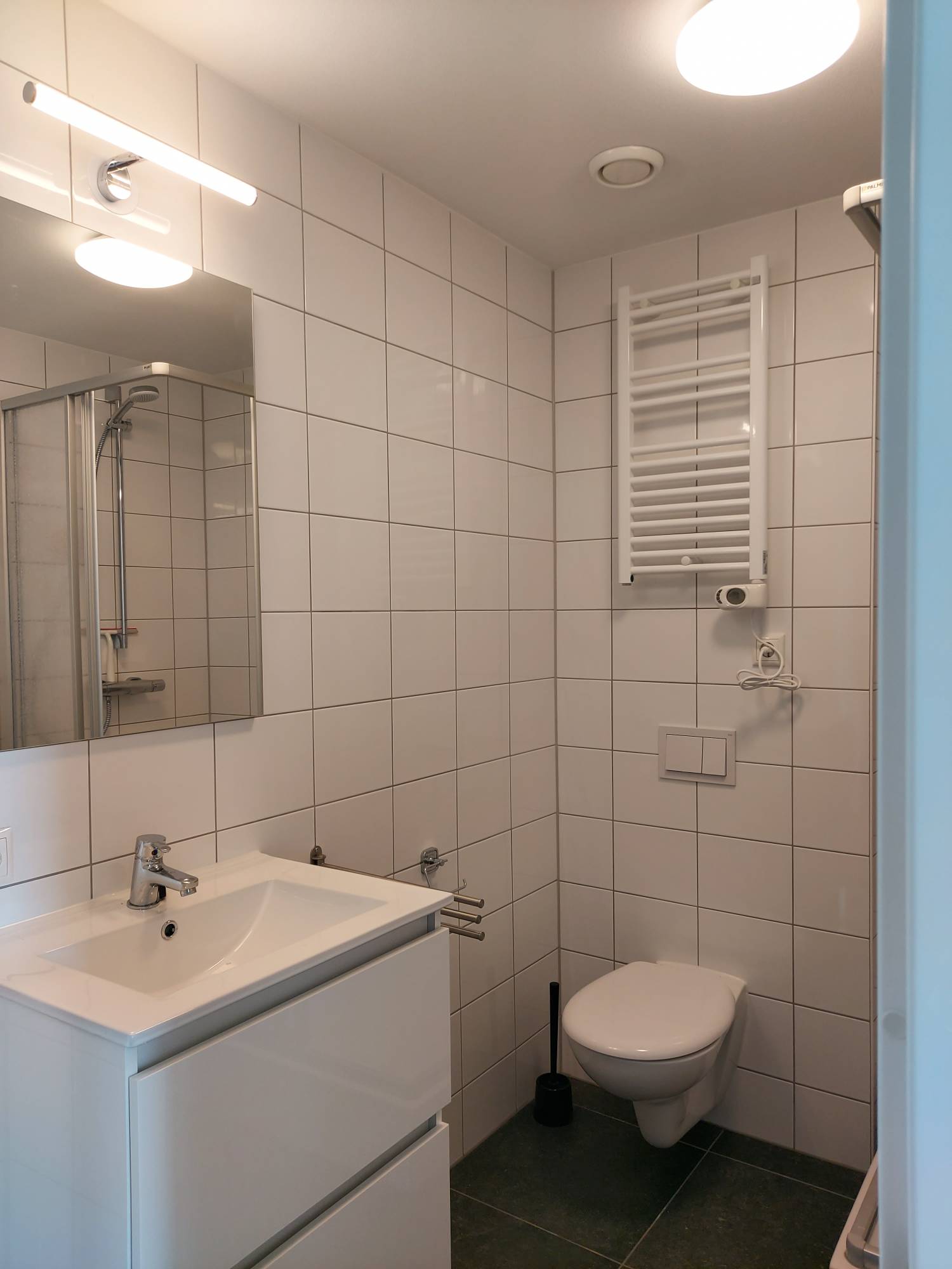 Via de doorgang bij de keuken bereik je de compacte maar complete badkamer. Deze is uitgerust met een hangend toilet, wastafel en een wasmachine. Alles praktisch en netjes afgewerkt.
