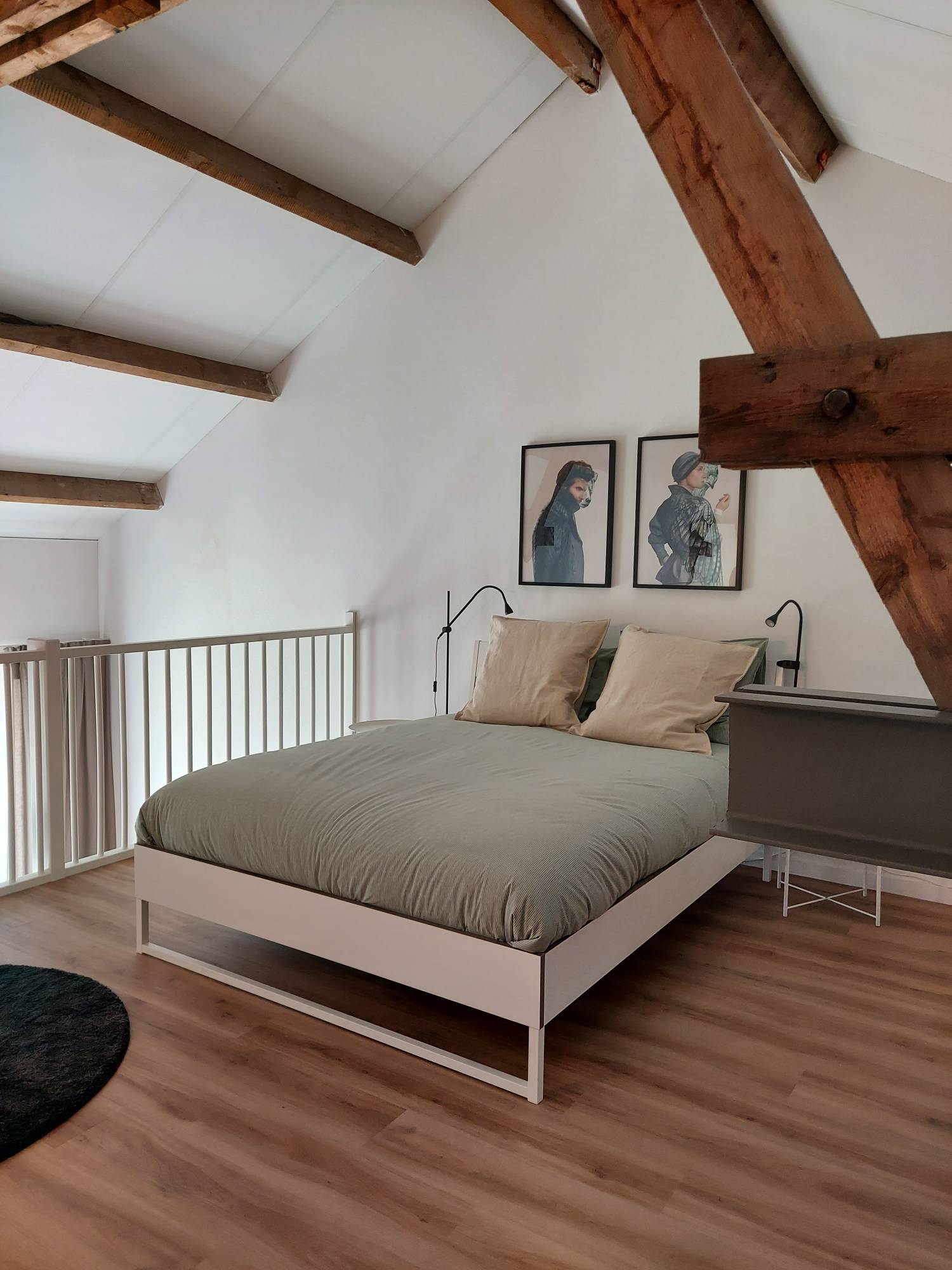 Een echte eyecatcher is de open trap in de woonkamer die leidt naar de vide. Deze open verdieping is ingericht als ruime slaapkamer met plek voor een tweepersoonsbed én een kledingkast. De vide zorgt voor een speelse indeling en versterkt het gevoel van hoogte en ruimte in de woning.