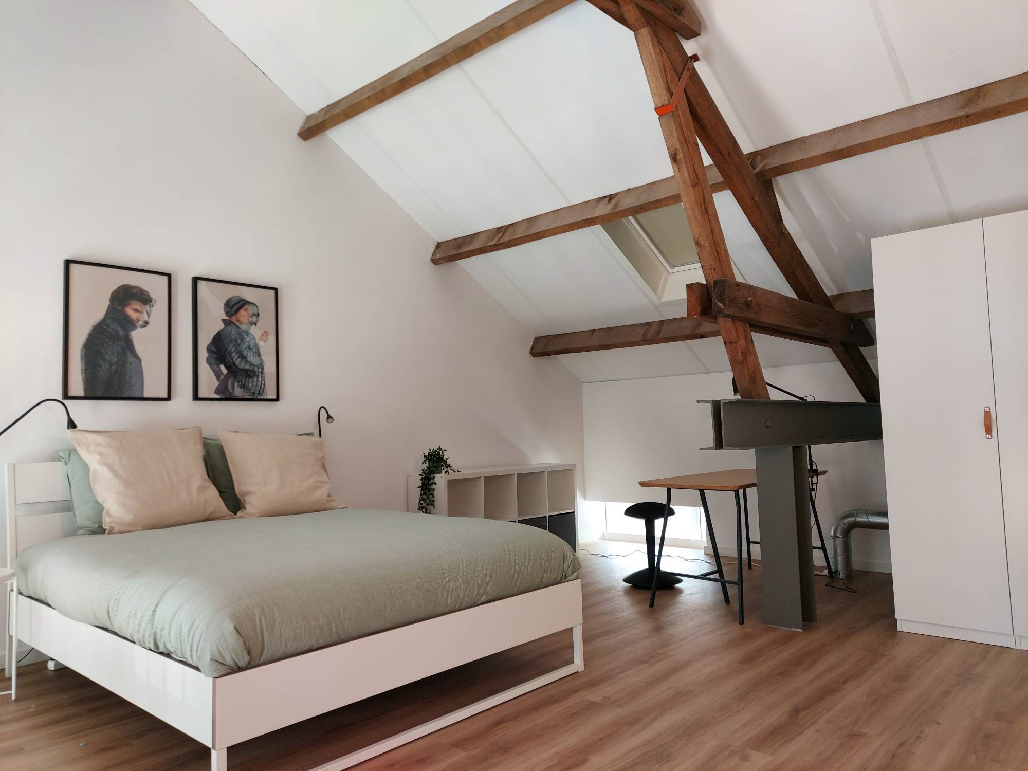 • Authentieke kenmerken zoals hoge plafonds, grote ramen en originele houten balken.