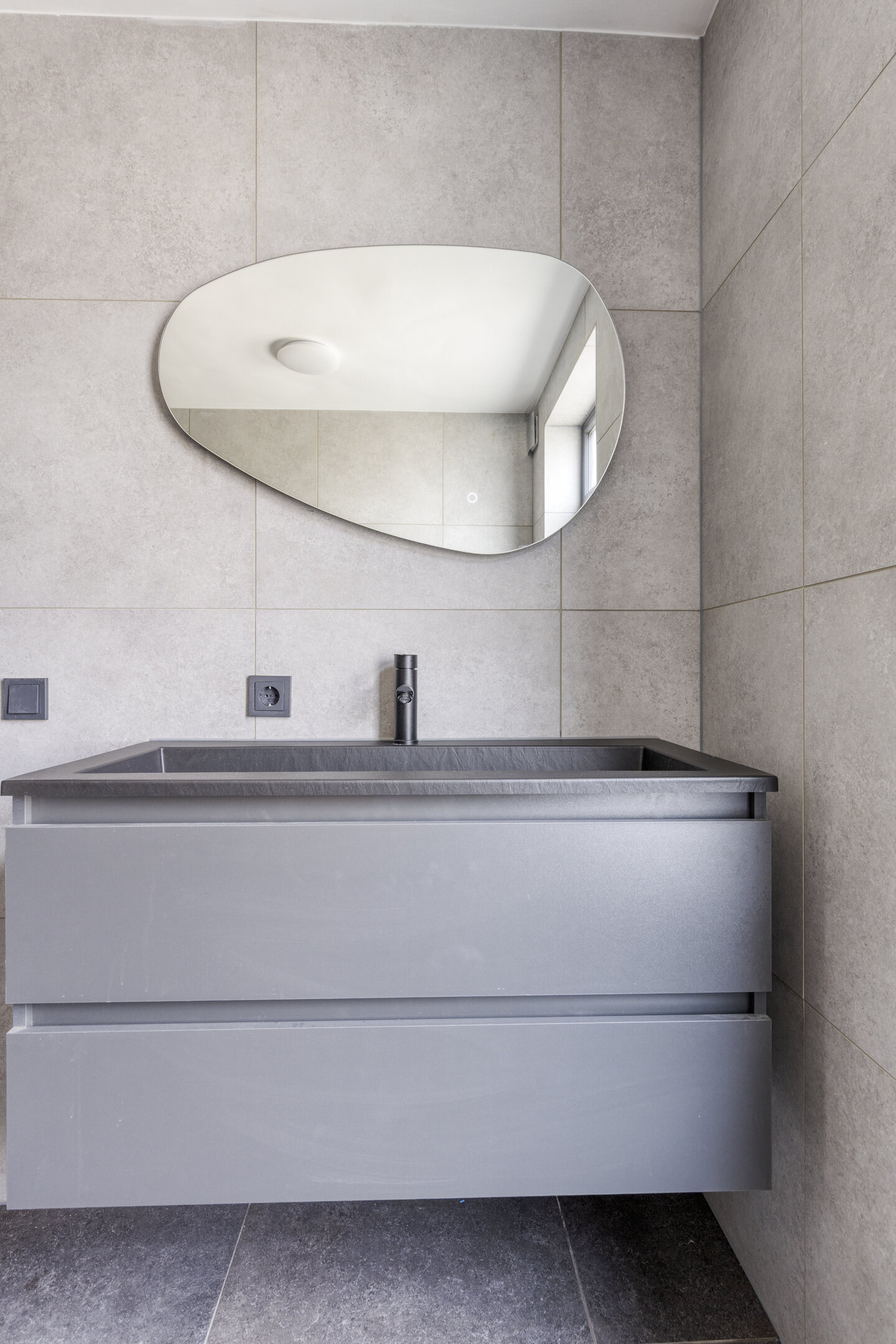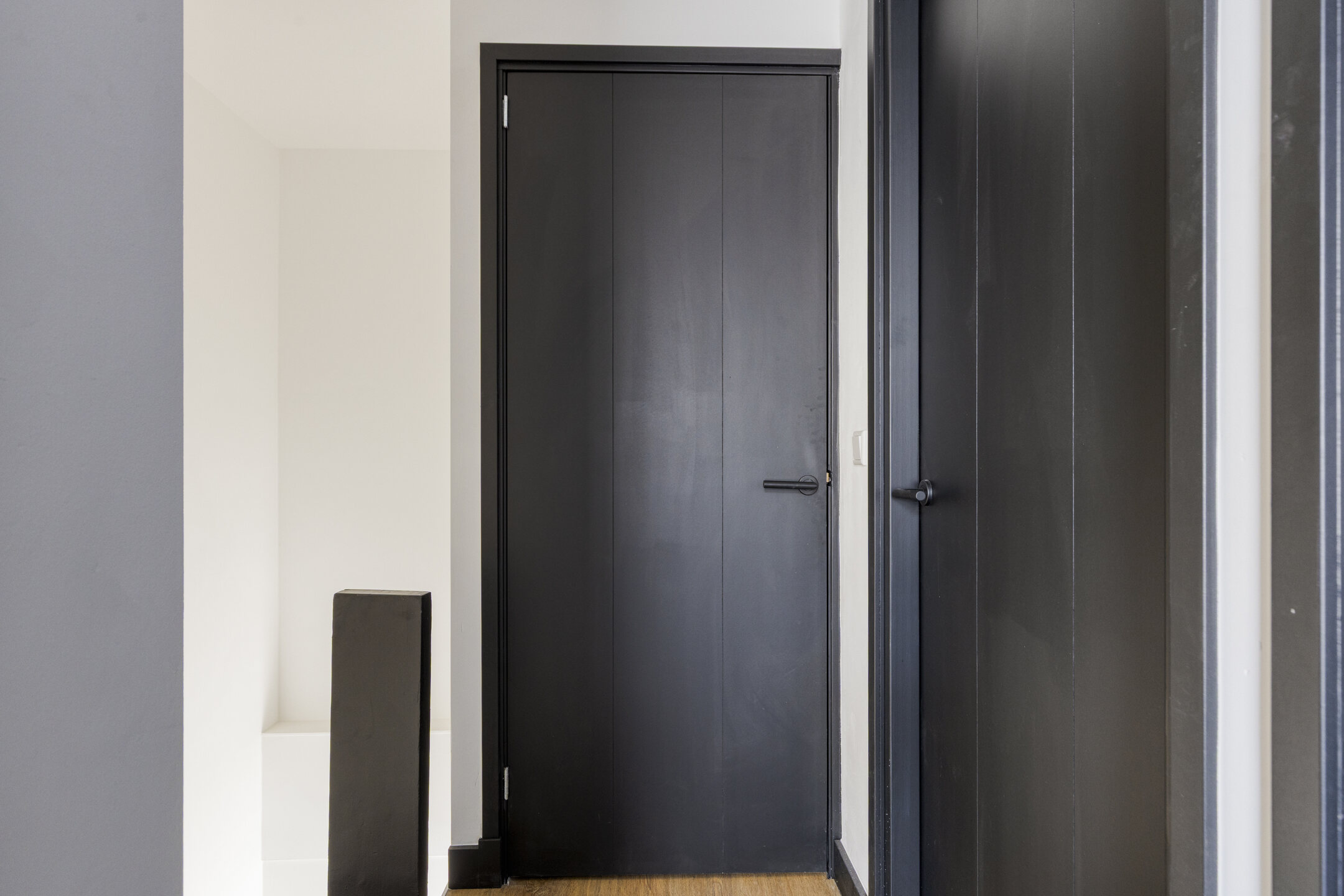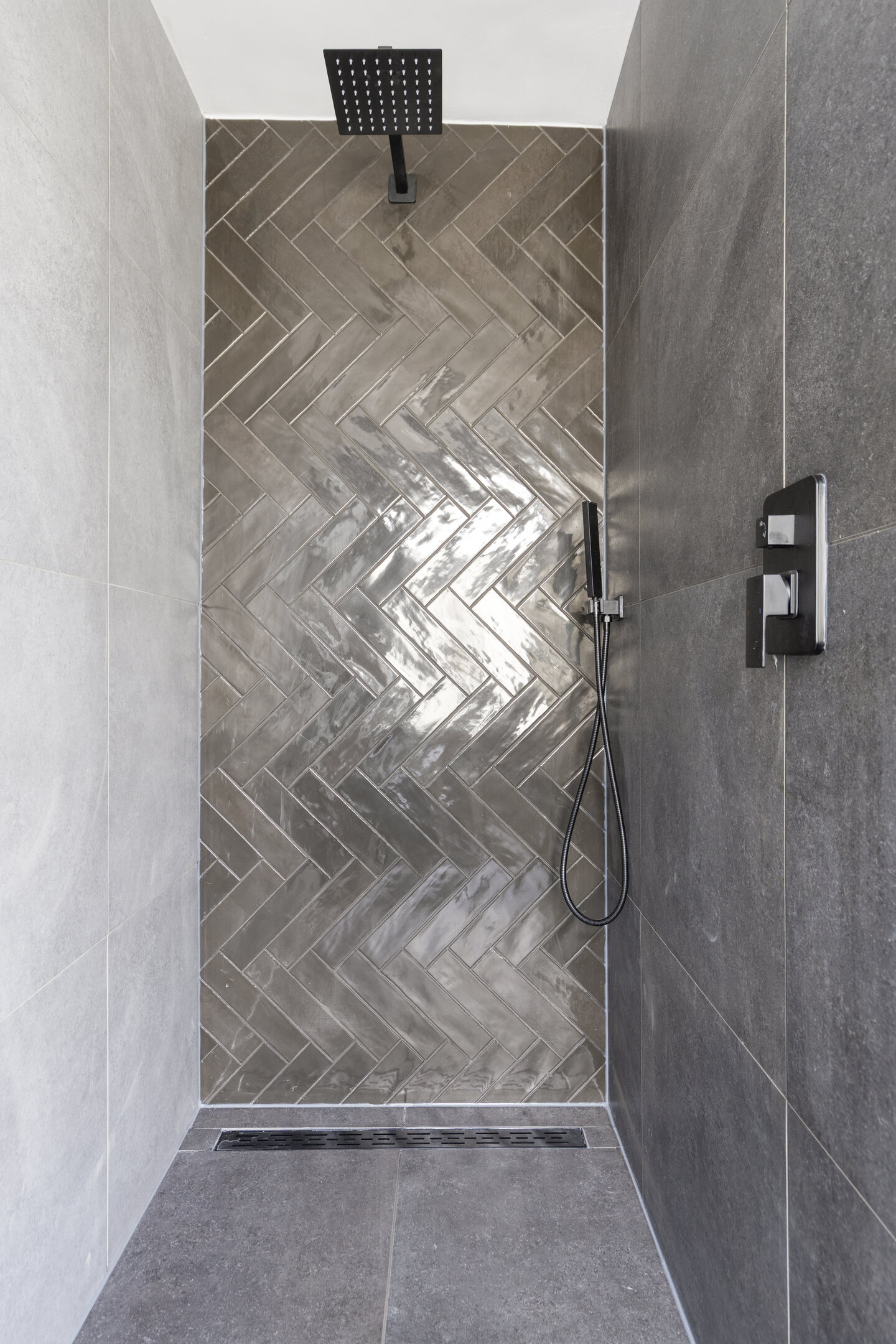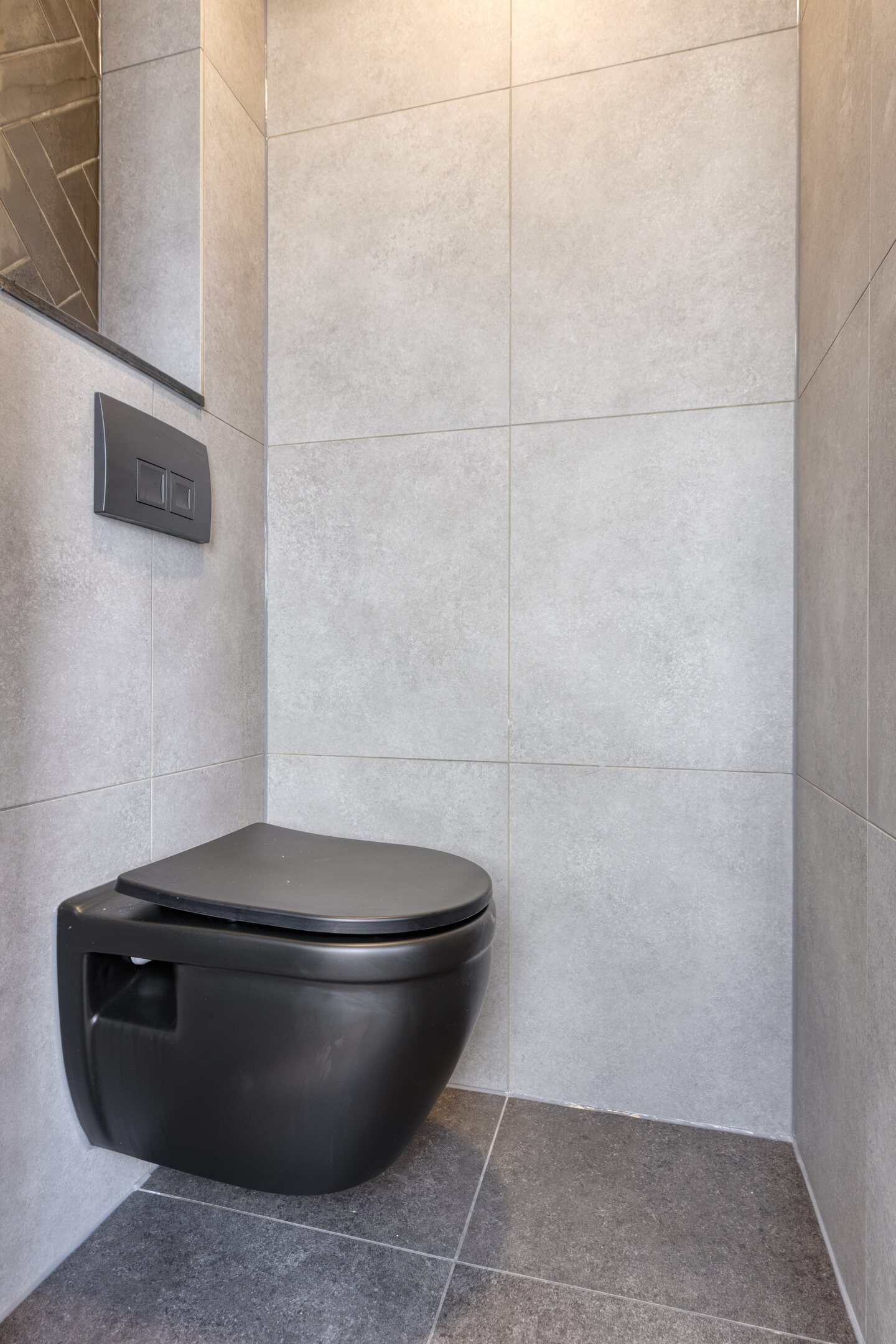De moderne en luxe badkamer is in 2025 geheel vernieuwd. De ruimte is voorzien van strak tegelwerk, een toilet, een wastafelmeubel, een designradiator en een inloopdouche met geïntegreerde kranen. Het zwarte sanitair geeft de badkamer een zeer moderne en stijlvolle uitstraling.