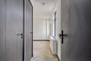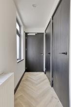 U komt binnen in de hal met de vernieuwde meterkast, een pvc-visgraat vloer en de toiletruimte. De toiletruimte is volledig en modern betegeld. Vanuit de hal heeft u toegang tot de woonkamer.