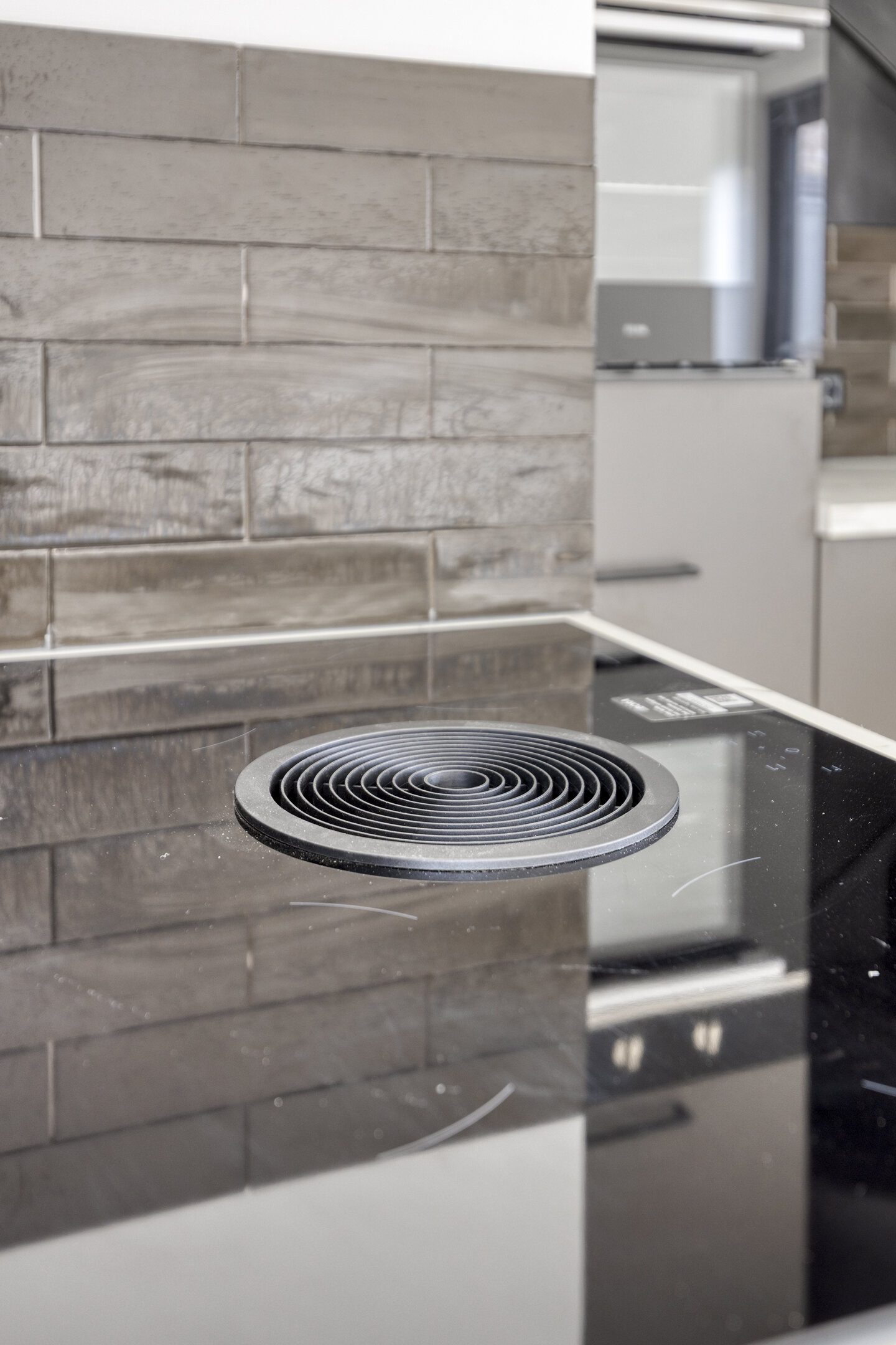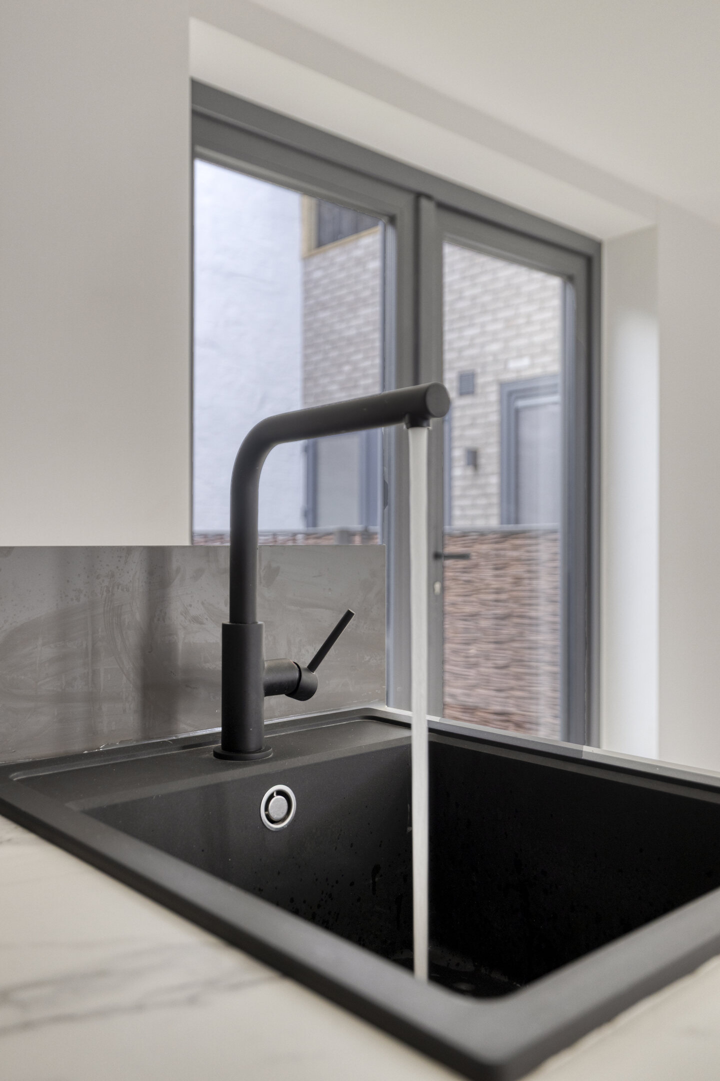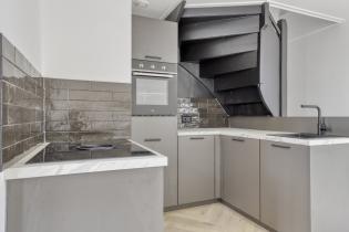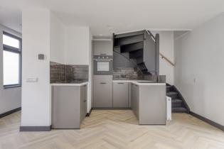 Beneath the stairs is the modern kitchen, arranged in an L-shape with plenty of practical space. The modern color scheme combined with a marble-look countertop makes the kitchen a true eye-catcher. Besides its stunning look, the kitchen is equipped with all necessary built-in appliances, including: