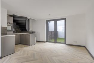 The spacious living room is also fitted with the same herringbone PVC flooring and includes a staircase to the first floor. Its generous layout offers ample space for both seating and dining areas. French doors open to the garden, providing a pleasant garden connection and lots of natural light.