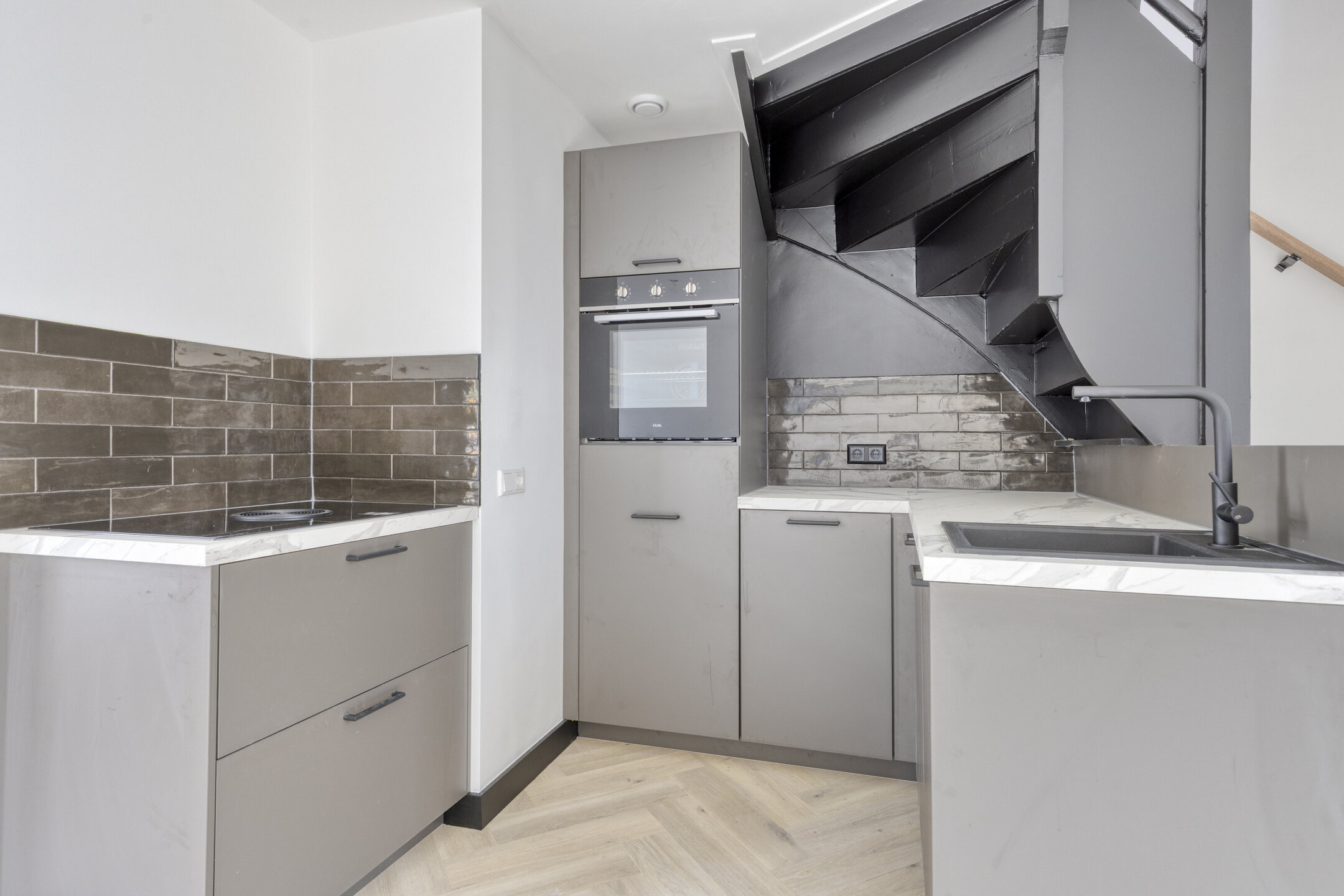 Onder de trap bevindt zich de moderne keuken. Deze is uitgevoerd in een hoek opstelling met veel praktische ruimte. De moderne kleurstelling in combinatie met een marmerlook werkblad maakt van de keuken een echte blikvanger. Naast een fraaie uitstraling beschikt de keuken over alle benodigde inbouwapparatuur, zoals een inductiekookplaat met BORA-afzuiging, een oven, een koelkast met vriesvak en een vaatwasser.