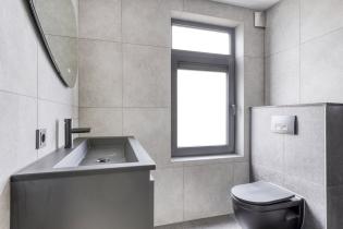 The modern, luxurious bathroom was completely renewed in 2025. It features sleek tiling, a toilet, a vanity unit, a designer radiator, and a walk-in shower with integrated taps. The black sanitary fixtures give the bathroom a very modern and stylish look.