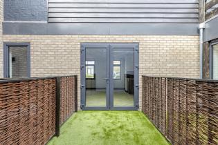 • Bedroom 2 faces the garden side and has the same PVC laminate floor, plastic window frames with triple glazing, tilt-and-turn windows, and ventilation.