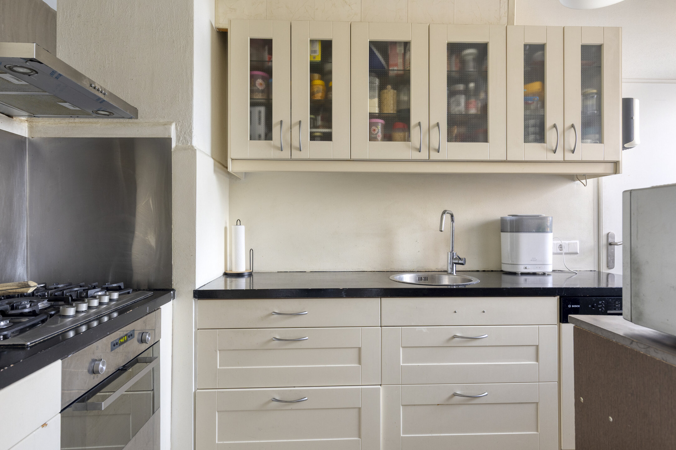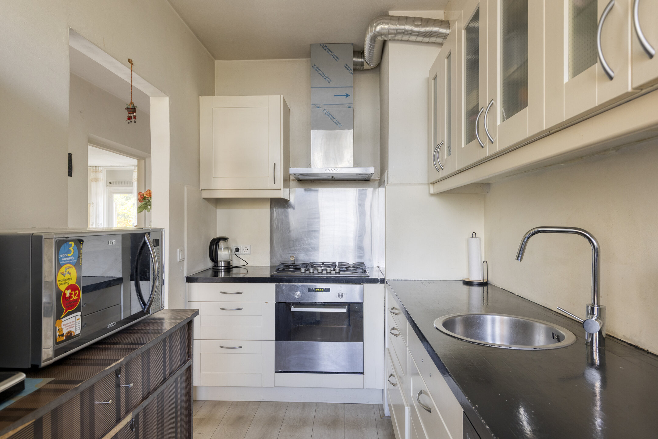 Aan de voorzijde bevindt zich de keuken, uitgevoerd in een lichte hoekopstelling met een zwart werkblad. De keuken is voorzien van een oven, 5-pits gaskookplaat, afzuigkap en vaatwasser. Er is volop bergruimte dankzij de boven- en onderkasten.