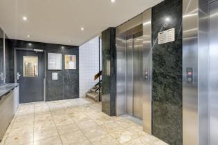 The entrance hall on the ground floor features a modern intercom panel and mailboxes. From here, you can reach the gallery on the third floor via the staircase or the lift. A private storage unit is also located on the ground floor.