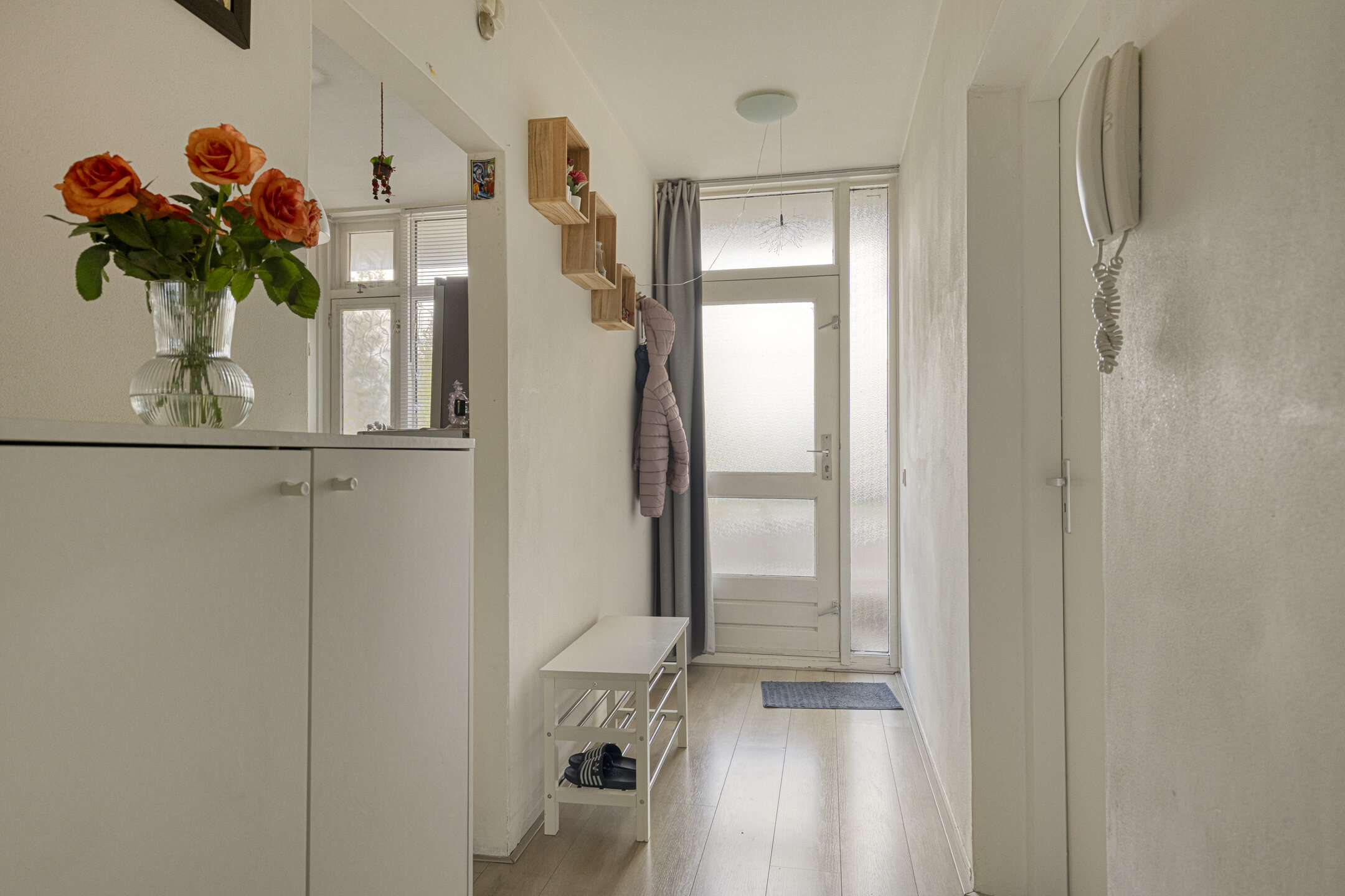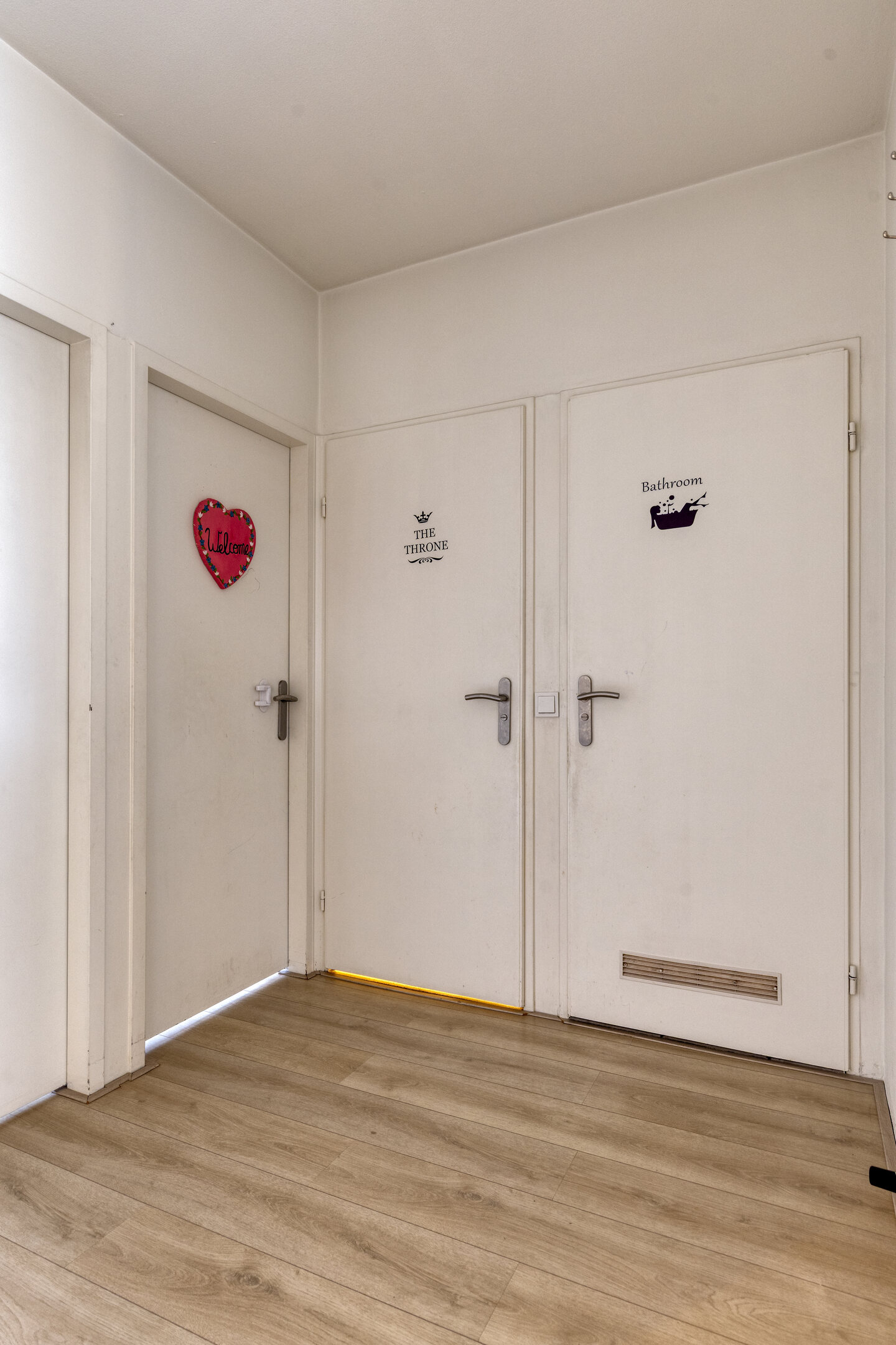Via de galerij op de derde verdieping, waar zich ook de meterkast bevindt, betreedt u het appartement. U komt binnen in de hal met nette laminaatvloer en intercom, die toegang biedt tot de verschillende vertrekken.