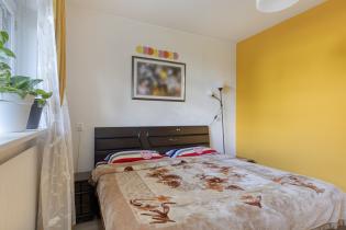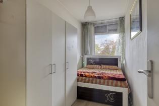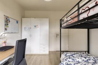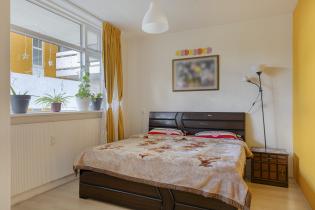 Opposite the kitchen is the first and largest bedroom (approx. 12 m²). This room has been smartly separated from the living room, creating a total of three bedrooms. It features a laminate floor, wooden window frames, and double glazing.