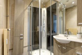 At the front of the apartment, you’ll find the kitchen, arranged in a light corner layout with a black countertop. The kitchen is equipped with an oven, 5-burner gas hob, extractor hood, and dishwasher, as well as ample cupboard space.