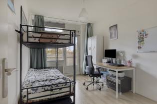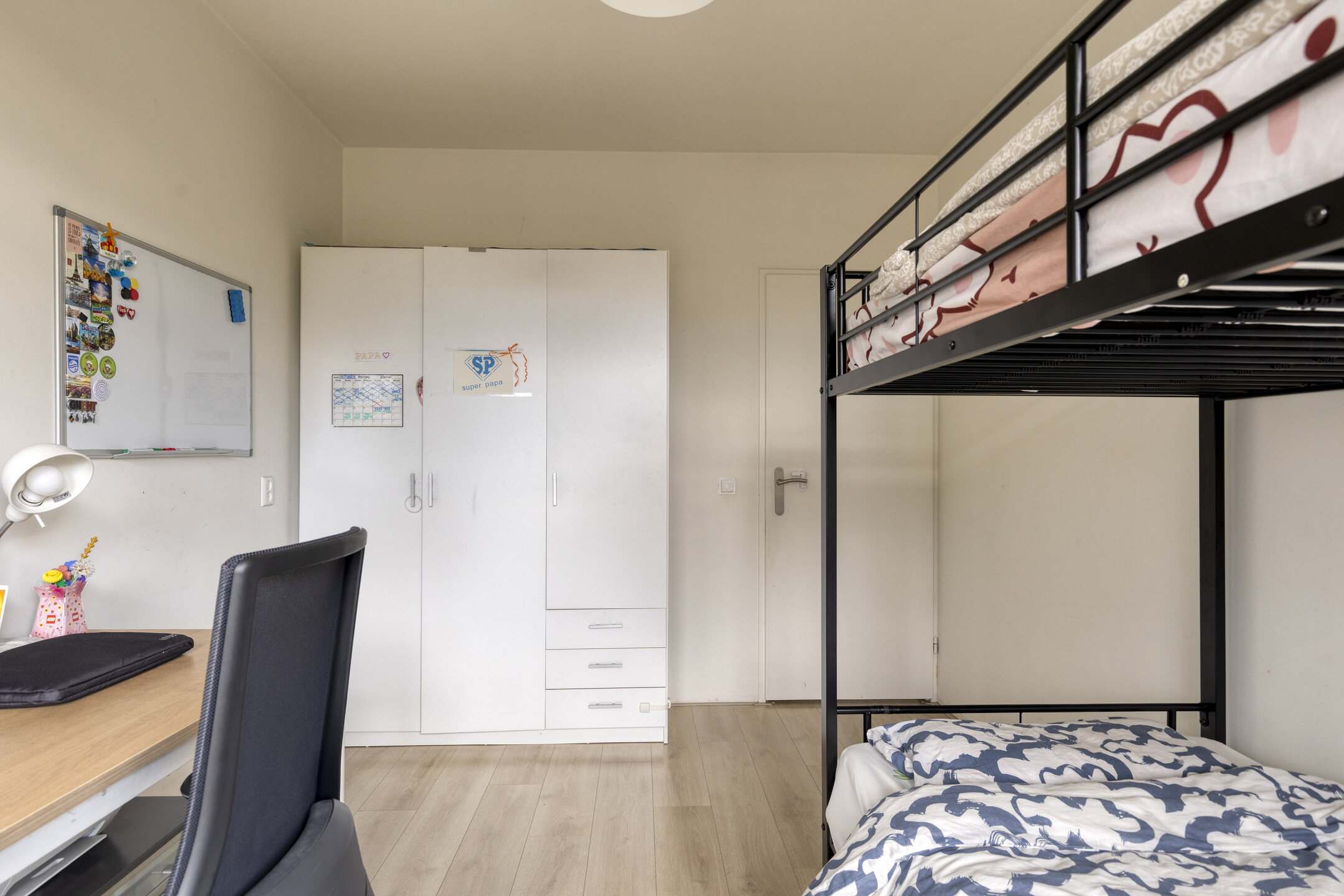 Tegenover de keuken ligt de eerste en grootste slaapkamer (ca. 12 m²). Deze kamer is op praktische wijze afgescheiden van de woonkamer, waardoor de woning nu over drie slaapkamers beschikt. De ruimte heeft een nette laminaatvloer, houten kozijnen en dubbele beglazing.