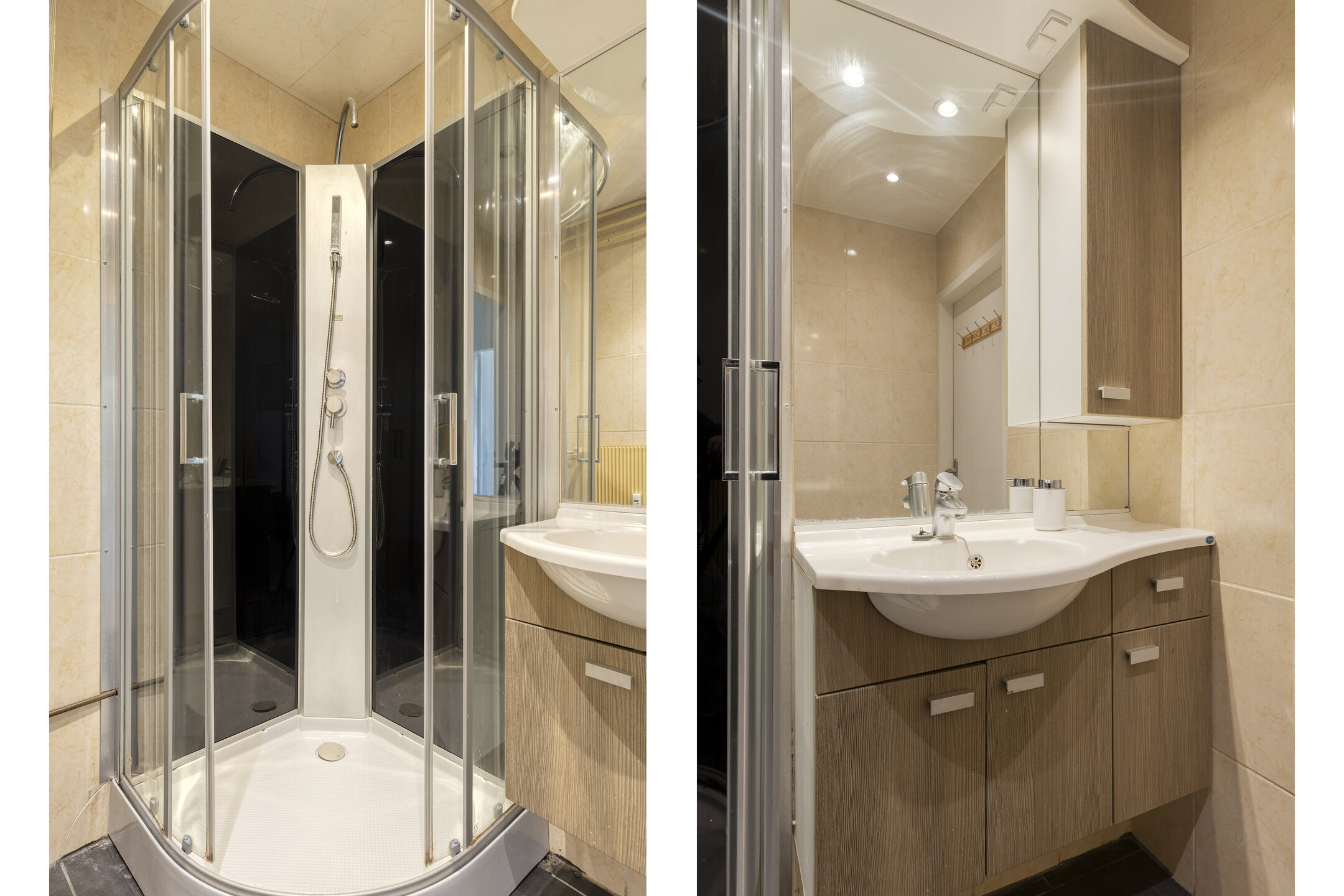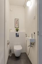 De badkamer is volledig betegeld en uitgerust met een douchecabine, wastafelmeubel, inbouwspots en extra opbergruimte. Naast de badkamer bevindt zich de moderne toiletruimte met zwevend closet, bidetfunctie en fonteintje.