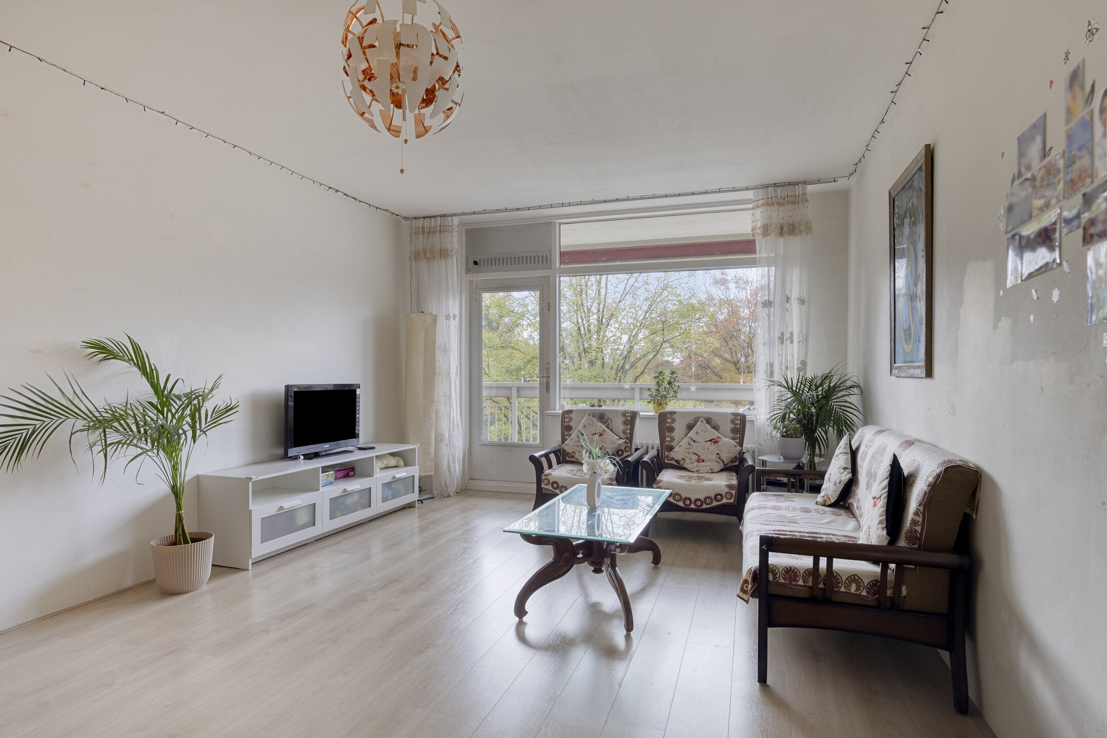 Vanuit de hal bereikt u via een glazen draaideur de lichte woonkamer. Deze ruime living biedt volop plek voor een comfortabel zitgedeelte en een royale eethoek. De woonkamer heeft houten kozijnen met dubbele beglazing en een loopdeur naar het balkon.