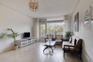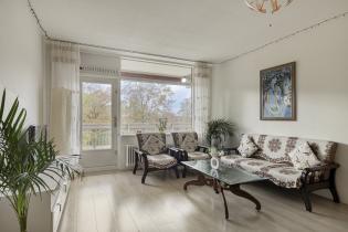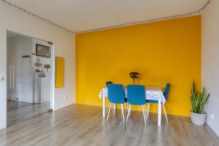 Through a glass door in the hallway, you enter the bright living room. This spacious living area offers plenty of room for a cozy sitting area and a large dining table. The rear wall features wooden window frames with double glazing and a door leading to the balcony.