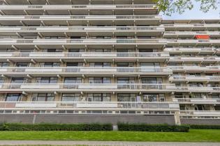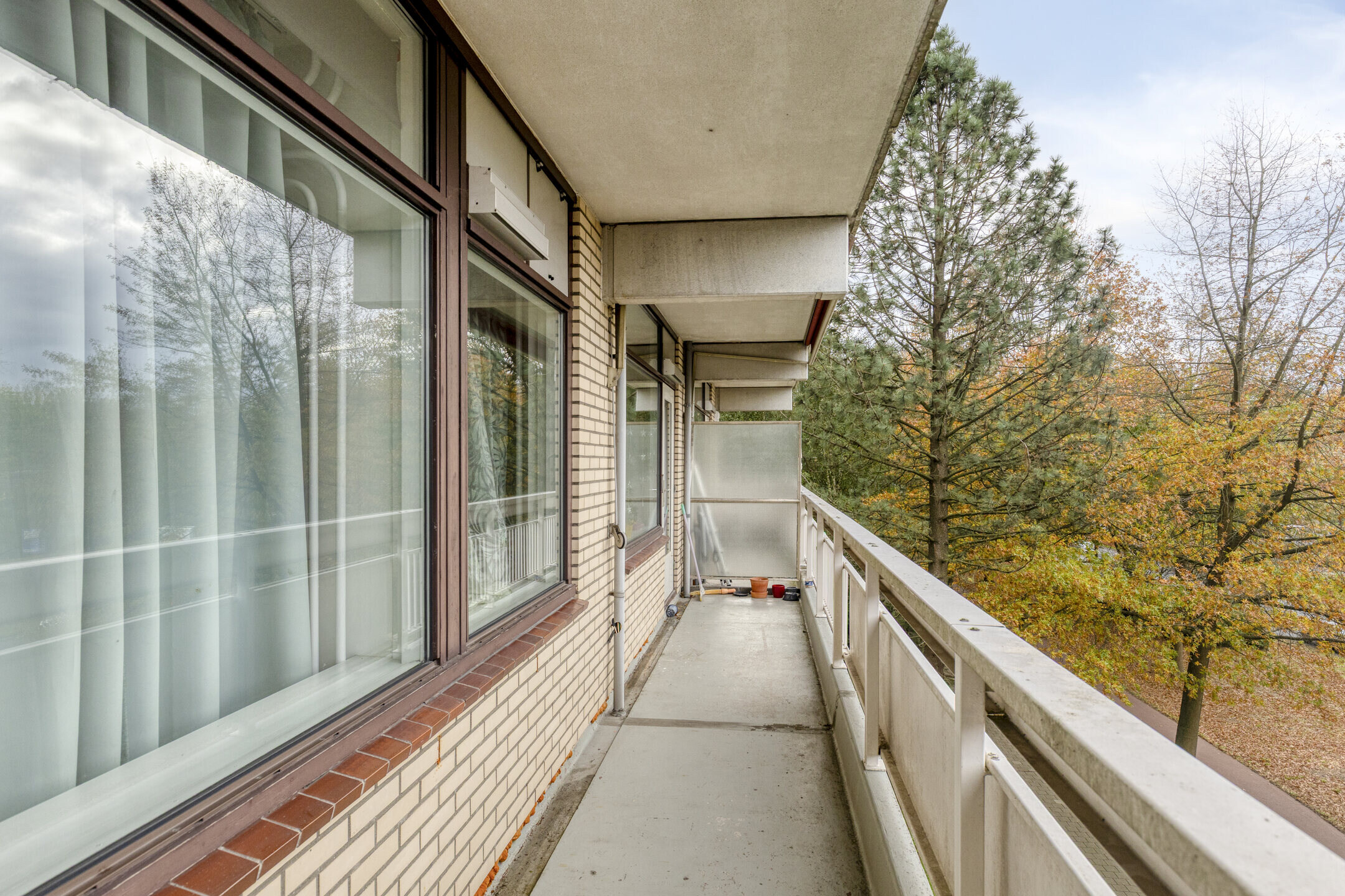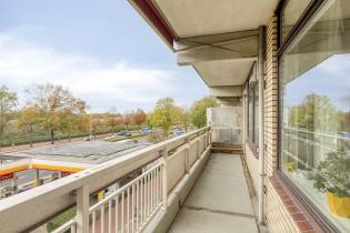 Het brede balkon strekt zich uit over de volledige breedte van het appartement en is toegankelijk vanuit zowel de woonkamer als een van de slaapkamers.