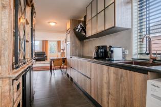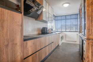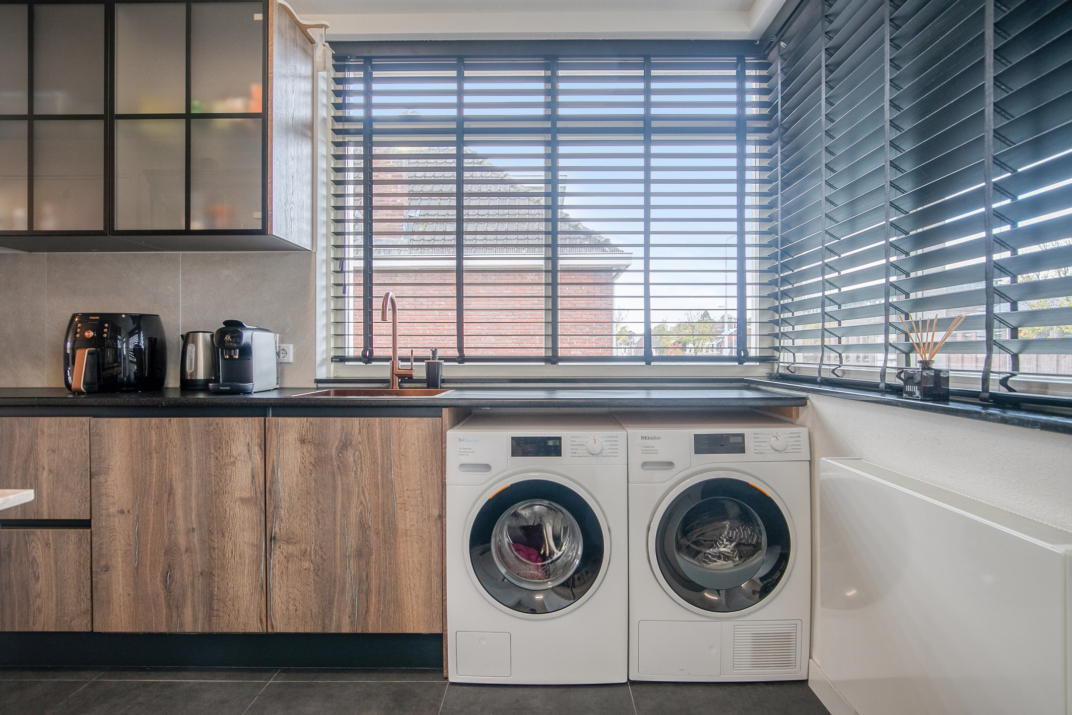 Aan de voorzijde ligt de moderne keuken met een rechte opstelling, voorzien van een inductiekookplaat, afzuigkap, oven, vaatwasser en koelkast. Ook is er aansluiting voor wasmachine en droger aanwezig. De keuken heeft een eigentijdse uitstraling met houtlook fronten, donkere details en een stijlvol composiet werkblad.
