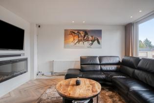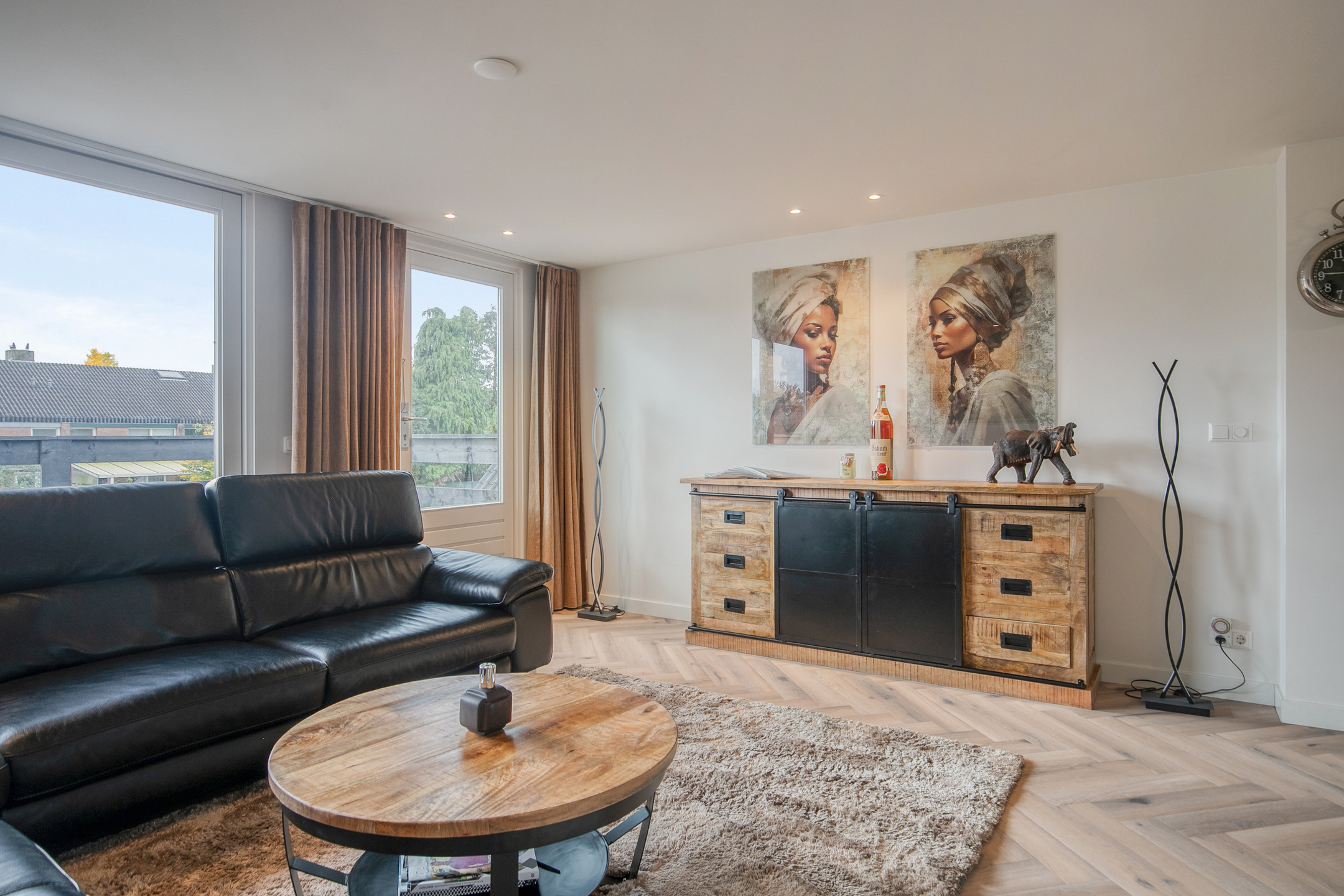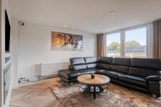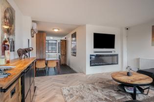 Via de kleine trap met verlichting kom je in de woonkamer. De woonkamer is heerlijk ruim en licht, afgewerkt met een pvc visgraatvloer, hardhouten kozijnen en elektrische rolluiken aan de achterzijde. Dankzij de elektrische haard en airconditioning (AUX, 2023) is dit een plek waar comfort en sfeer samenkomen. Via openslaande deuren is er toegang tot het ruime dakterras, een fijne plek om in alle rust van de zon te genieten.