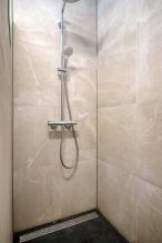 The bathroom is modern and fully tiled, equipped with a washbasin with cabinet, walk-in shower with rain shower, and a radiator.